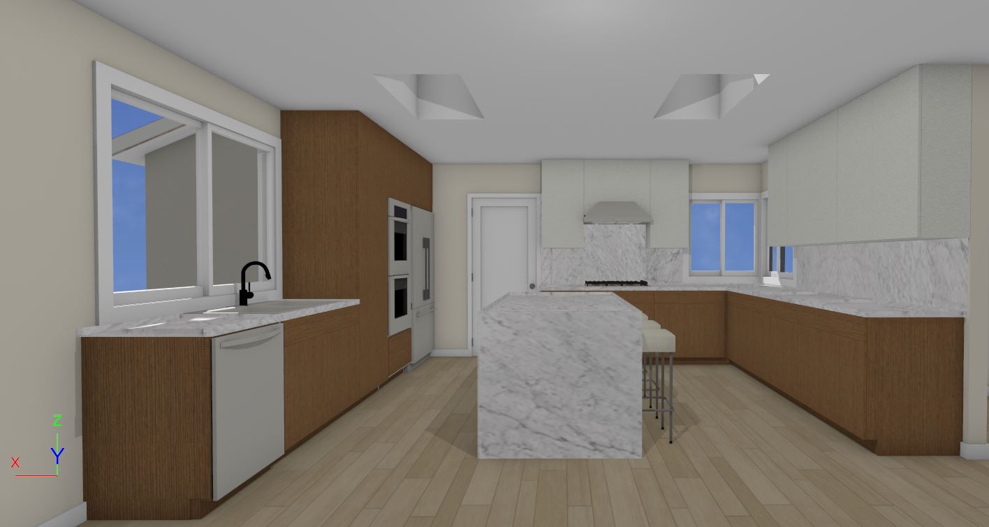 brown wood base and full height cabinets carrara marble on counter tops and backsplash and white wall cabinets black metal faucet and stainless steel appliances