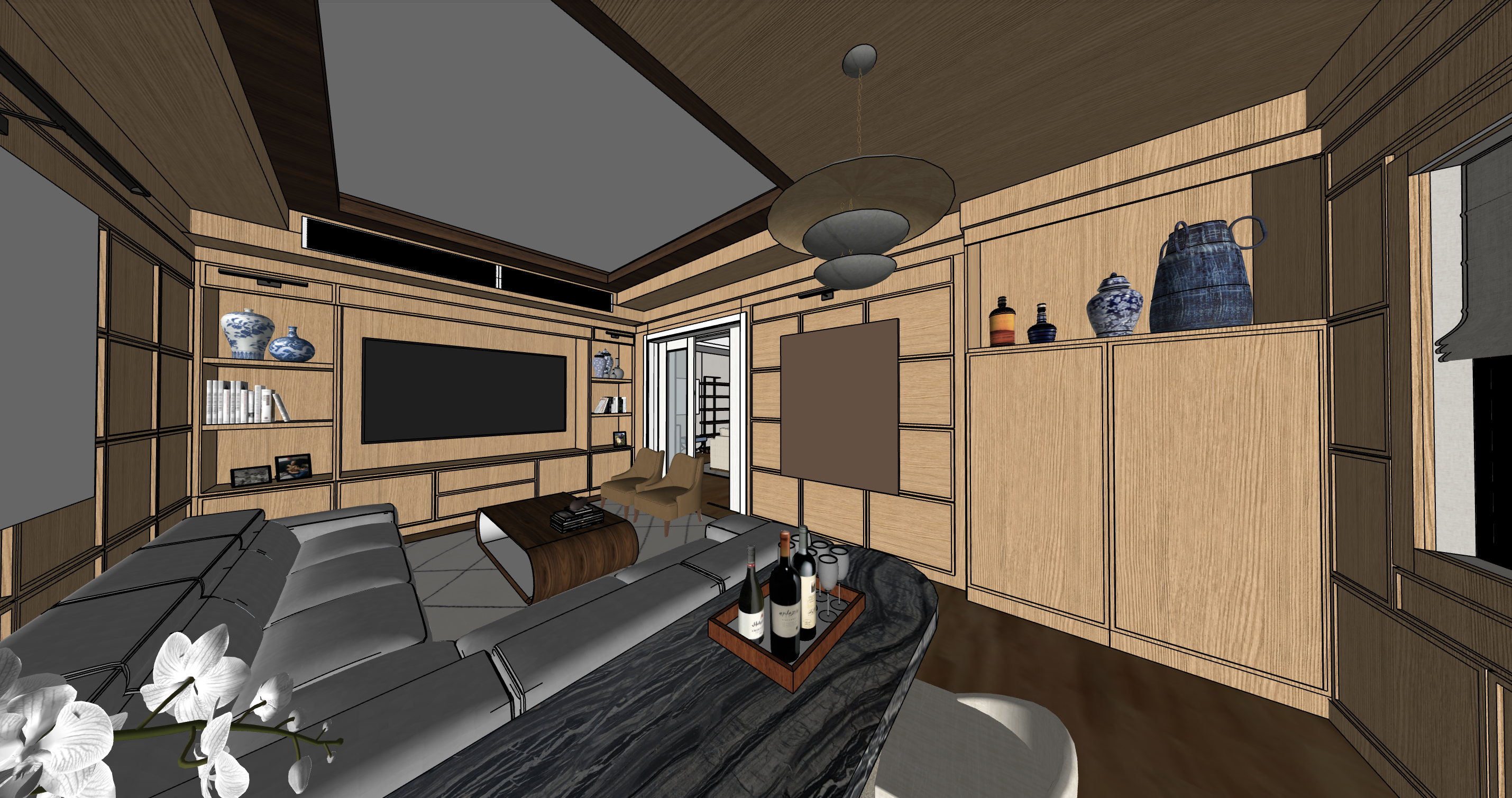 add lights to pendant and picture lights on wall the wood in walls is white oak and trims are oak the trim around center ceiling is mahogany the pendant is dark bronze maintain design leather sofa light grey add daylight add light to pendant door is white and door trim