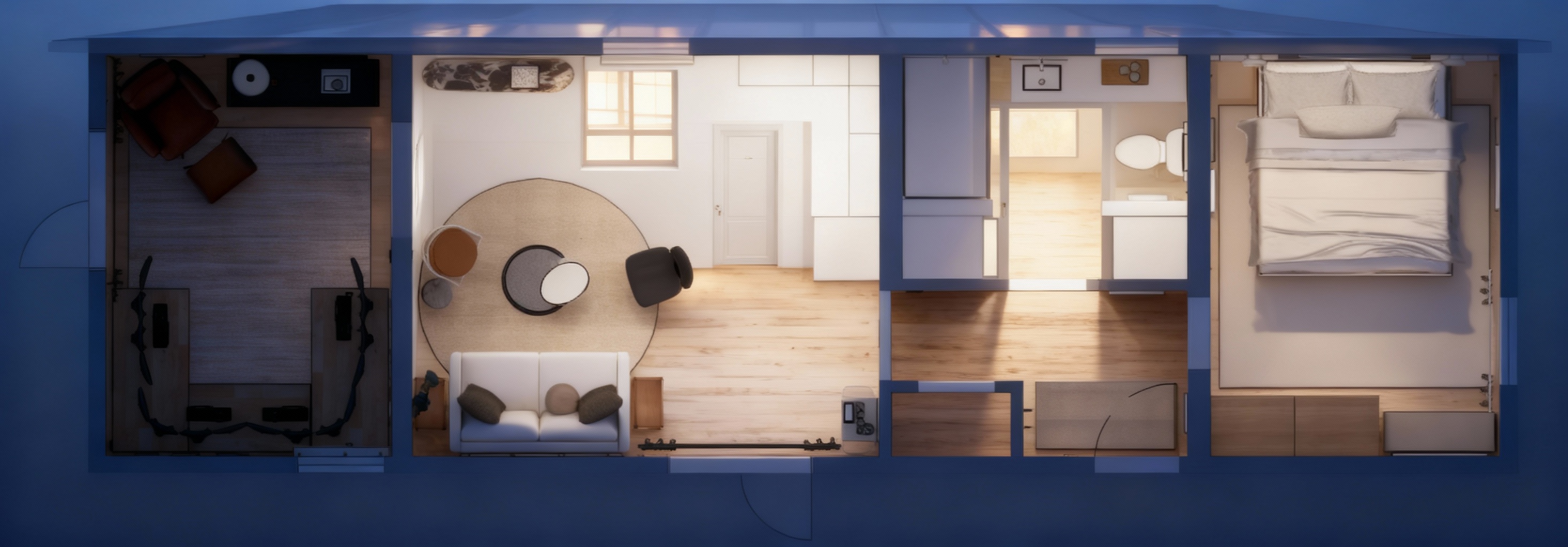 make the ceiling white beige add books to the shelves add shades to the windows keep everything else the same