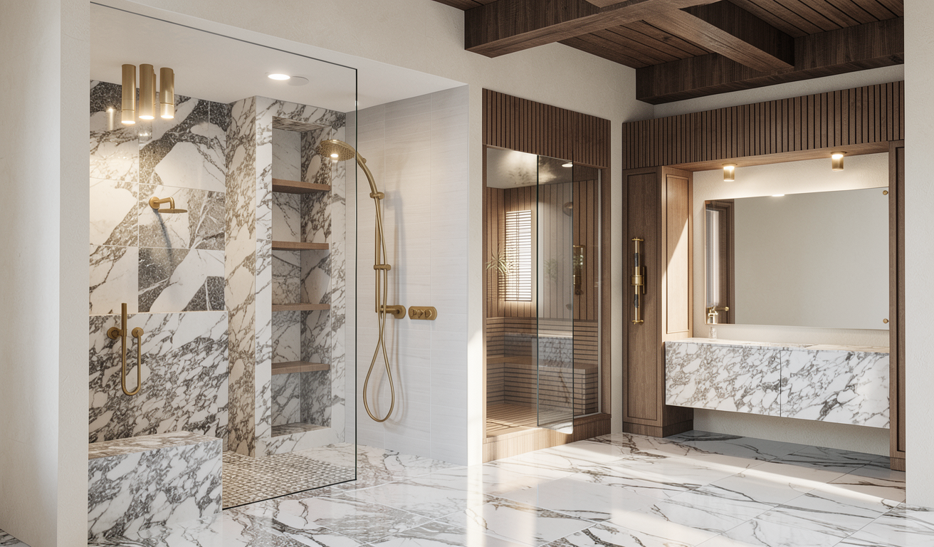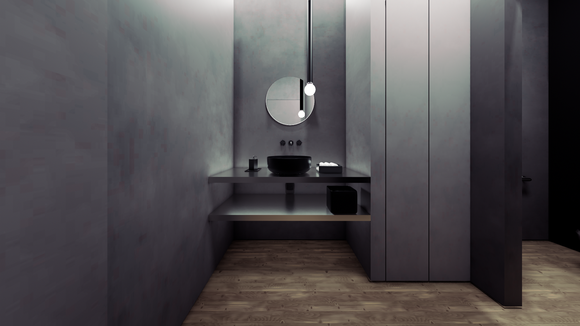 architectural interior render a minimalist powder room smooth micro cement walls in muted gray tones floating stainless steel vanity shelves with matte black vessel sink and wall mounted black fixtures round backlit mirror warm natural oak hardwood flooring moody dramatic lighting with soft ambient glow emanating from bathroom interior high end contemporary residential design photorealistic 8k render sharp material detail cinematic depth of field subtle vignette enscape render style