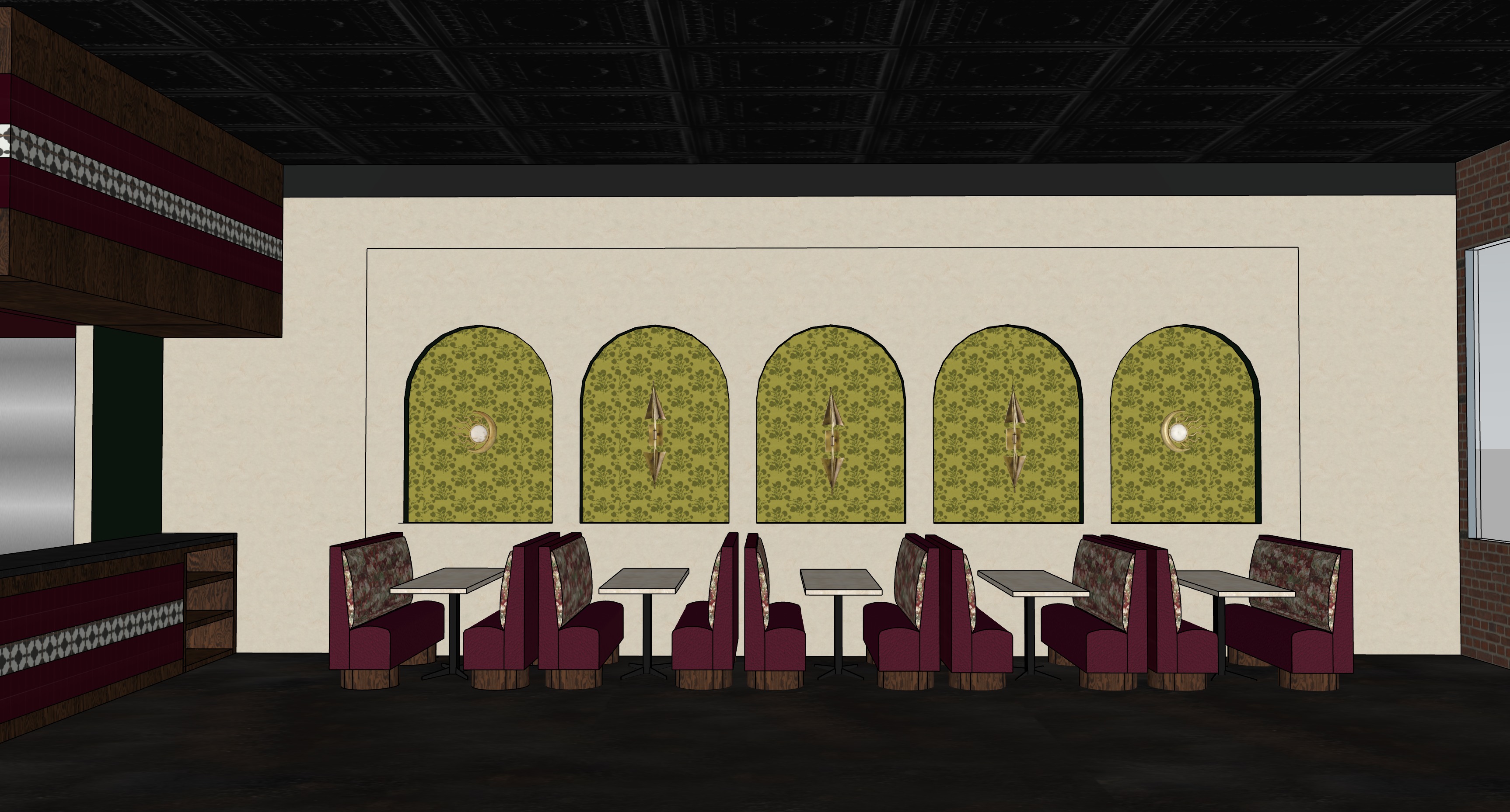 ultra photorealistic professional interior photography of a high end spanish inspired restaurant banquette seating area creamy stucco textured plaster walls with recessed arched alcoves containing vintage yellow green floral wallpaper warm brass wall sconces centered in each arch alternating between sculptural elongated cone sconces and frosted globe sconces emitting soft warm 2700k ambient light with realistic glow and falloff custom upholstered banquette seating in rich burgundy textured leather with subtle weave detail backrests feature inset patterned upholstery panels with realistic fabric depth and stitching banquette base constructed of dark stained oak wood plinth with visible wood grain texture and matte satin finish tables are solid honed travertine stone tops with natural pores tonal variation and slightly eased edges supported by matte black steel pedestal bases with subtle wear and soft reflections floor is dark polished concrete with realistic micro texture subtle reflectivity and natural imperfections lighting is cinematic and layered soft indirect ambient lighting warm accent lighting from sconces subtle bounce light and gentle shadow gradients physically accurate global illumination ray traced reflections ambient occlusion and contact shadows camera perspective is straight on eye level interior architectural photography 35mm lens perfectly symmetrical composition shallow depth of field but overall sharp focus professional hospitality photography editorial quality ultra high resolution extremely detailed textures realistic materials natural imperfections filmic color grading style references high end hospitality interior photography boutique luxury restaurant architectural digest professional commercial interior shoot render settings photorealistic ray tracing global illumination physically accurate lighting ultra detailed 8k resolution cinematic lighting sharp focus realistic materials no stylization no illustration no cgi look