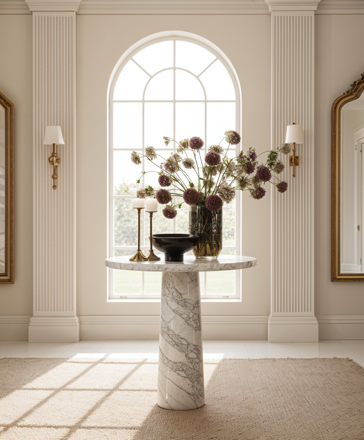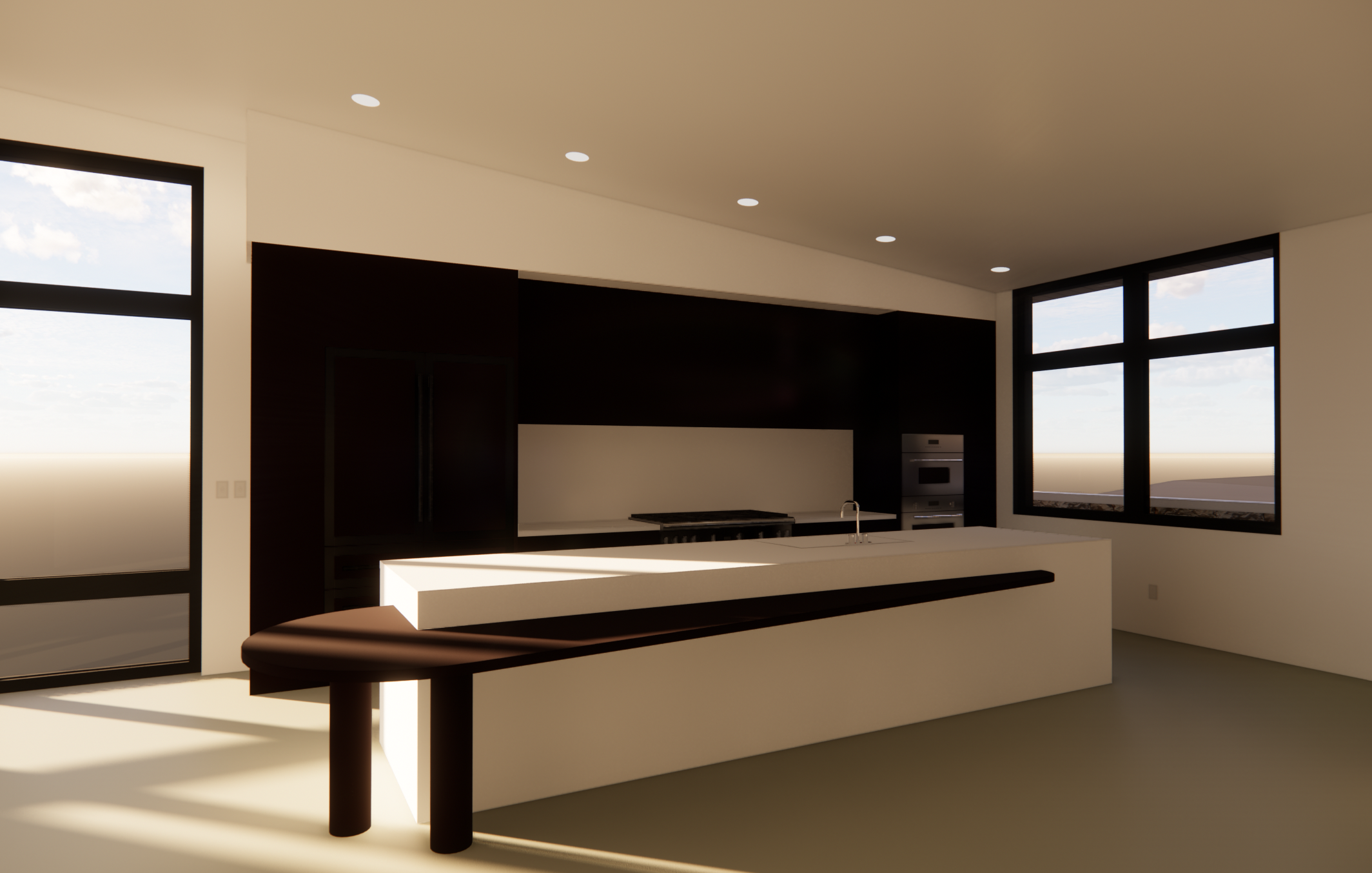 interior shot modern walnut kitchen sloping wood plank ceiling white oak floors modern bubble chandelier statement marble counters two tier island with light wood lower counter