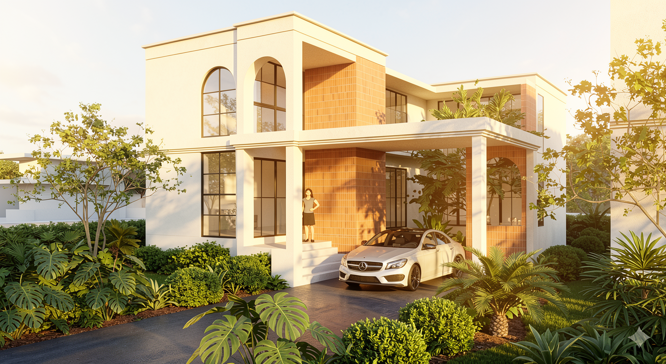 modern architecture light greige structurated concrete plaster facade late afternoon matte coated titanium zinc roof in light greige natural oak main doors sky with little clouds matte coated steel fence in light greige light grey beige aluminium windows photorealistic architectural visualization facade and ornamental grasses at the entrance illuminated by ground mounted spotlights ceiling lighting of the entrance door
