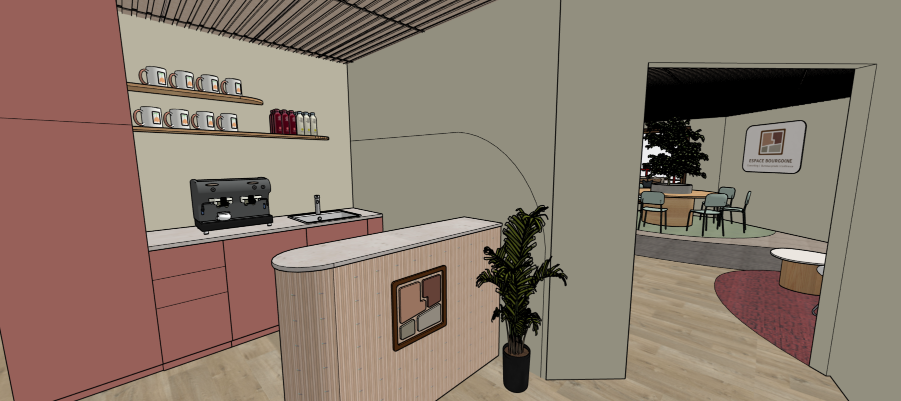 add small tiles as a backsplash and suggest a wall paint with simple geometric curved shapes max 3 colors