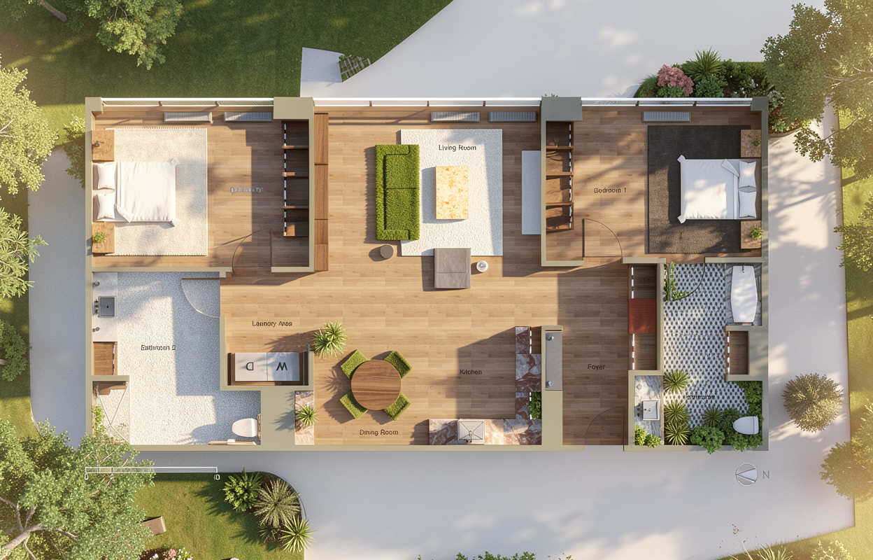 sharpen materials and landscaping do not change architecture do not add extra sunlight make less wet