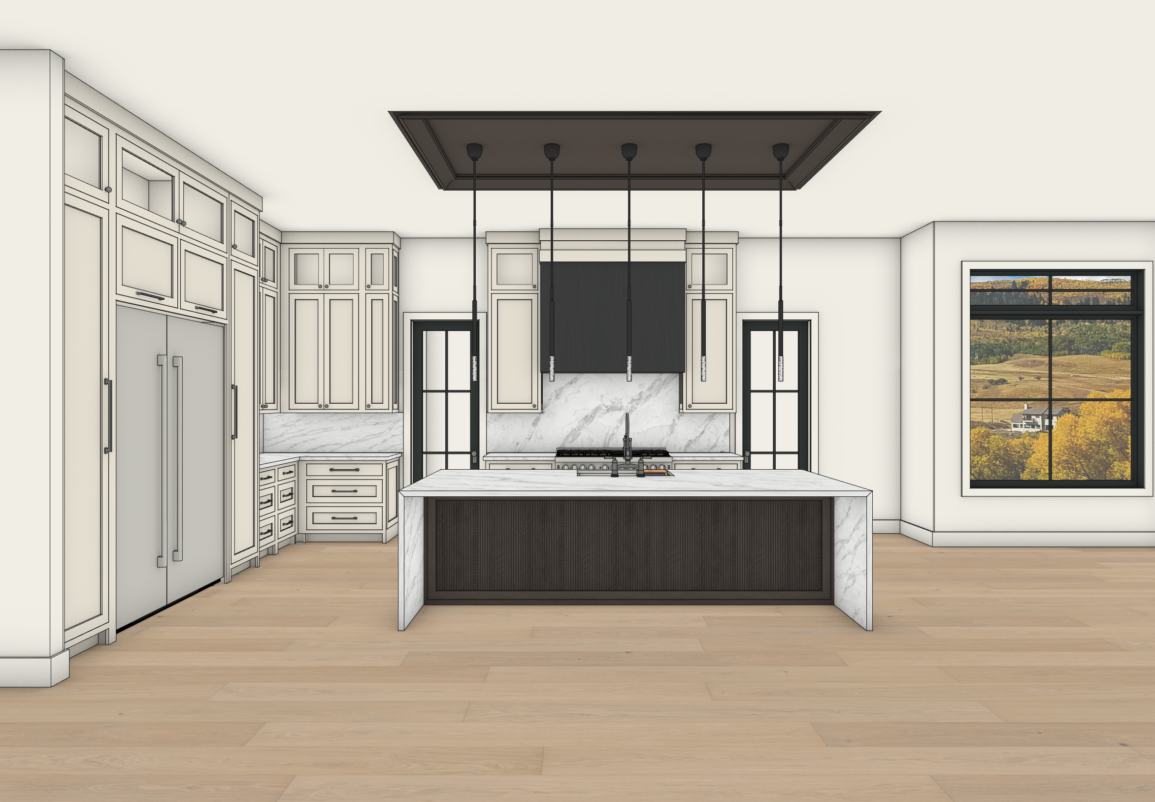 a modern kitchen with elegant off white cabinetry complemented by greyish granite countertops and a central island in deep black the atmosphere is warm and inviting with natural light streaming through large windows enhancing the rich tones of the light oak hardwood flooring black minimalist pendant lights hang from the ceiling adding a touch of sophistication outside a scenic view of golden autumn trees and rolling hills under a clear blue sky the overall mood is chic and cozy
