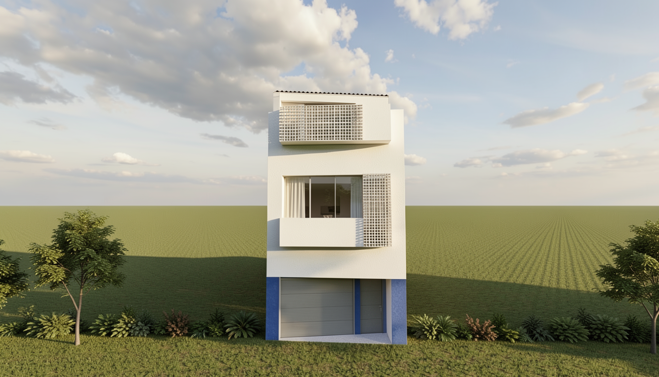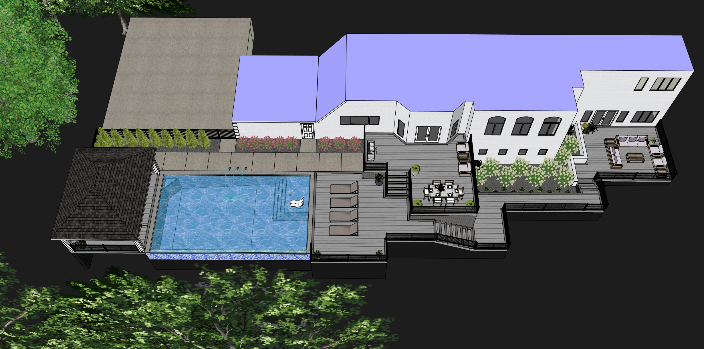 create a photorealistic exterior rendering from this sketch up view use realistic materials accurate scale and natural proportions apply soft daylight with realistic shadows global illumination and subtle reflections enhance textures without changing geometry or color maintain the original camera angle and composition produce a clean professional real world visualization realistically animate the deck jets on the side of the pool without changing the geometry