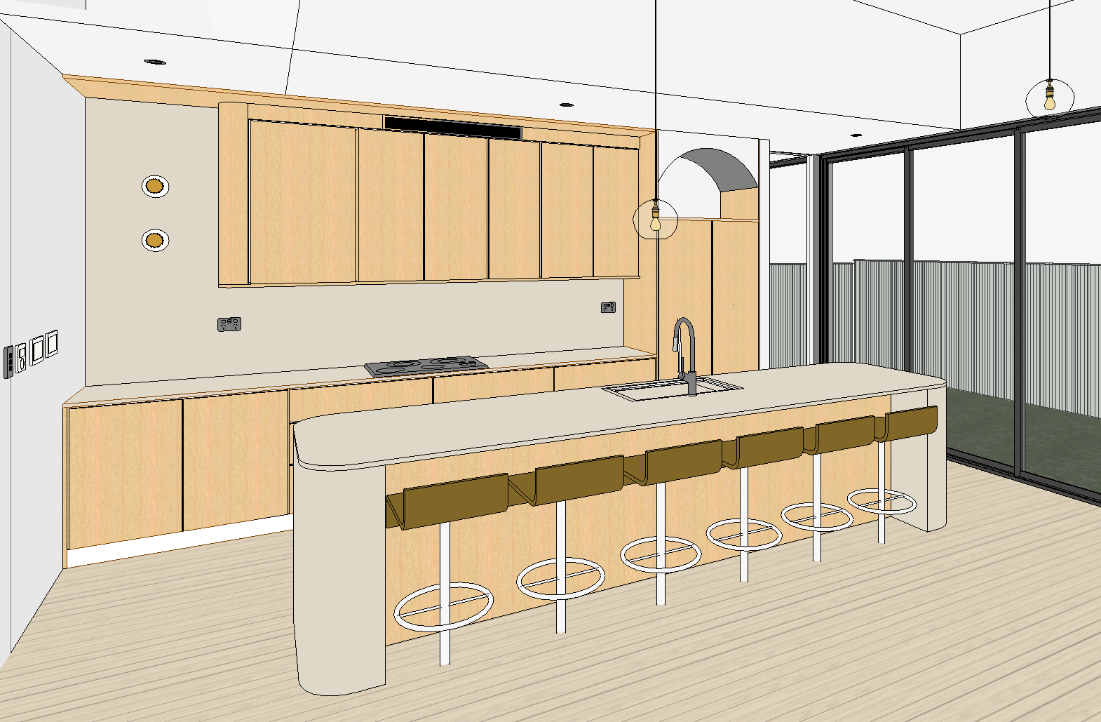 modern mediterranean kitchen interior with pale oak cabinetry doors the countertops is a champagne stone benchtop with minimal veins adding a luxurious touch the splashback on the wall behind the kitchen to be the same stone as the bench led strip lighting to underside of overhead cabinetry kitchen to have kitchen equipment setting soft ambient lighting from long horizontal led light with 16 spherical orbs around creates a warm and inviting atmosphere the walls are a natural white with subtle texture enhancing the contemporary feel the floor is a light oak timber floorboard with veins to add depth the overall mood is cozy yet sophisticated blending minimalism with mediterranean design outside to be lawn with trees shrubs and groundcover brushed rose gold light fitting neutral tones calming atmosphere modern serene ambiance realistic 8k render