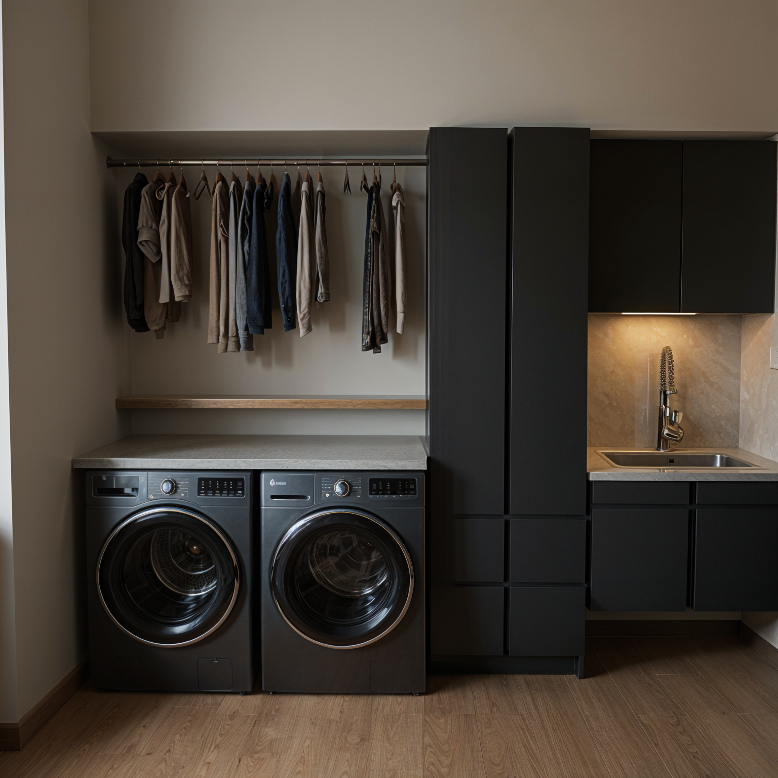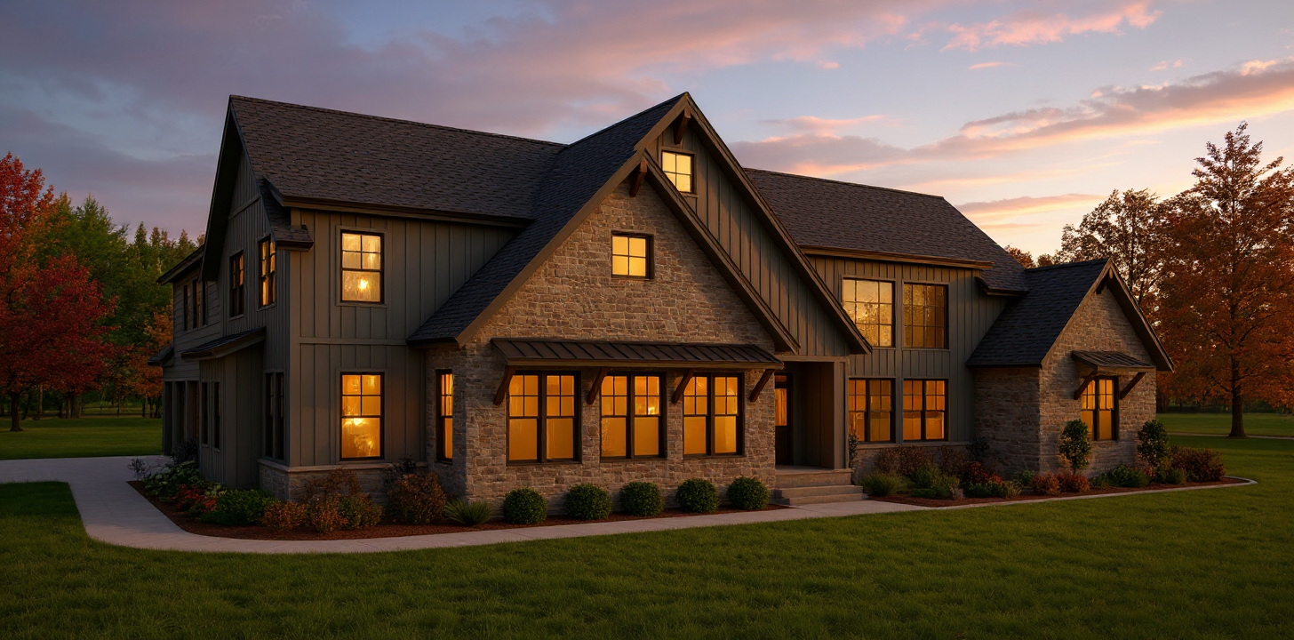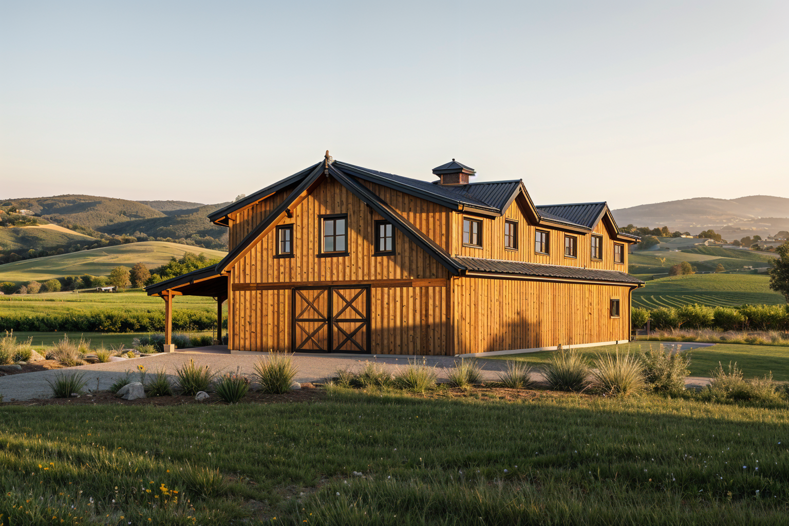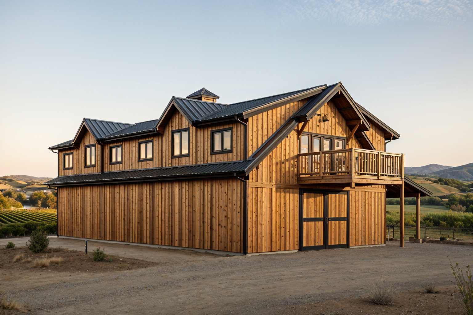 clean timber clad architectural exterior rendered in cinematic golden hour lighting dark trim around sliding barn doors under deck warm vertical wood siding with similar simple minimal grain pattern black roof visible prominent sonoma winery landscape in the background natural wood textures high fidelity photorealistic visualization crisp shadow falloff refined fa ade geometry richly detailed grain patterns soft atmospheric depth calm minimal landscaping premium architectural photography mood ultra clean composition and materials natural ground