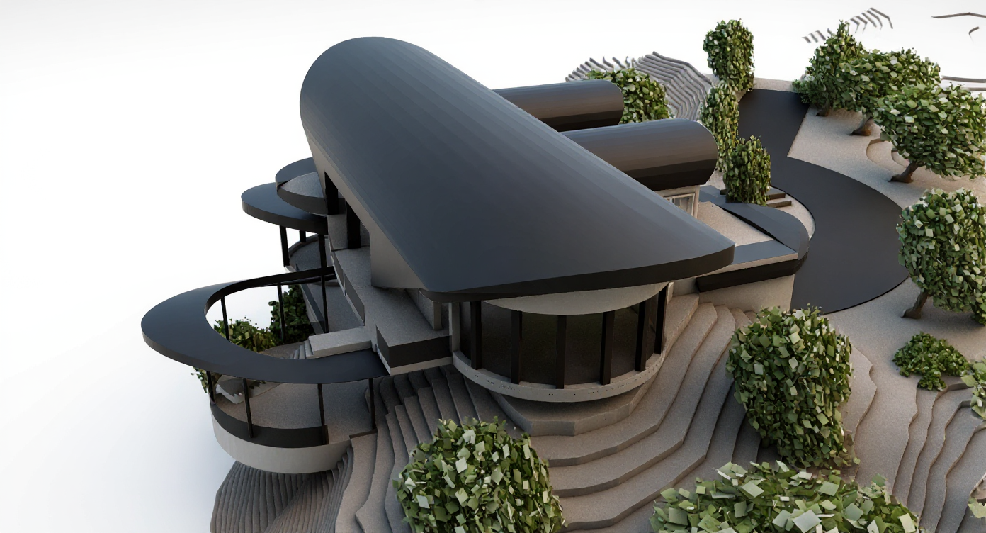 render the building from the reference image in a soft architectural render style not hyper realistic aim for a studio visualization or watercolor wash aesthetic with gentle shading and simplified materials maintain the exact geometry of the model 1 roof black corrugated metal readable but stylized show the black corrugated metal roof with clear but softened rib lines corrugation should be visible but rendered in a subtle illustrative way not photoreal use gentle light dark bands rather than harsh reflections 2 exterior walls vertical metal panels represent walls as vertical metal panels with softened seams light gray metal appearance with watercolor like tonal variation avoid flat gray shading add subtle vertical strokes or gradients 3 windows black steel frames black steel window mullions with clean thin lines render glazing with a minimal watercolor like reflection or slight tint keep the frames crisp but not glossy 4 site context place the building on a tall mountain with stylized terraced terrain the left portion must visibly cantilever over the cliff emphasizing elevation use simplified vegetation and terrain textures that feel hand rendered or softly painted 5 atmosphere composition add soft clouds around the upper mountain area use a pure white sky that fades gently into the image make the edges of the entire rendering softly fade to white as if placed on a presentation board overall lighting should be diffuse calm and painterly 6 overall style prioritize an architectural rendering aesthetic soft shadows minimal linework watercolor style tonal washes clean presentational look do not use hyper realistic lighting reflections or surface detail the mood should be artistic gentle and diagram friendly while still clearly conveying material textures produce a soft stylized architectural rendering with watercolor qualities clear building materials and a white faded composition