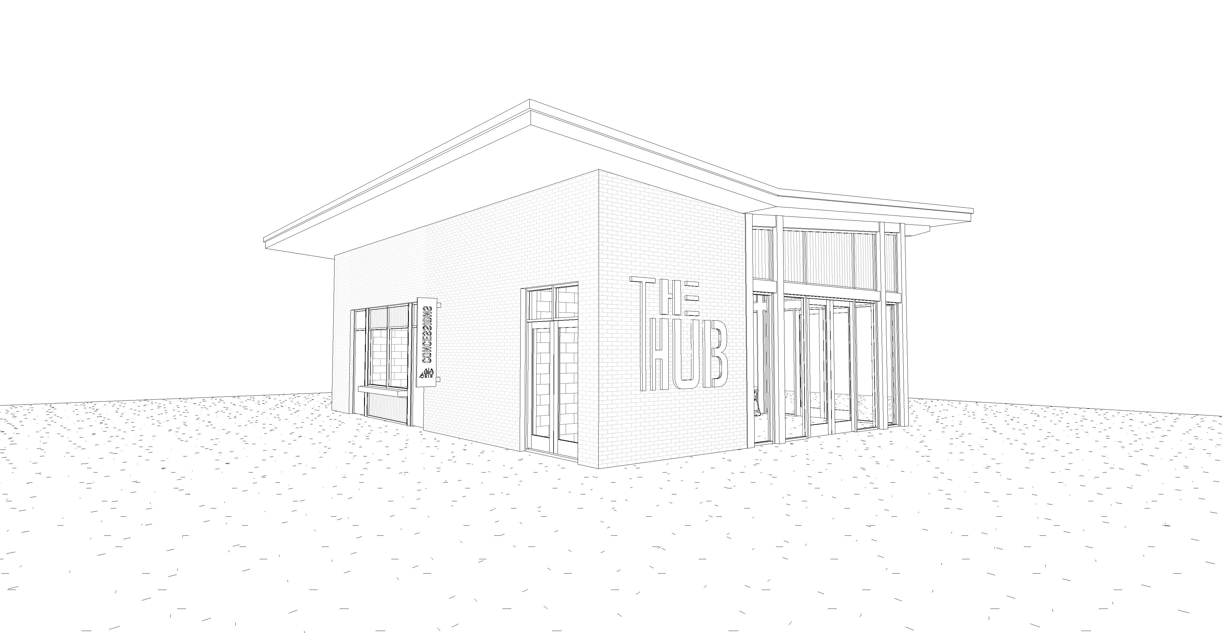 design a 1 200 square foot pavilion located in selma alabama situated near a riverfront setting with a contextual relationship to the historic surroundings the architectural concept should blend vintage historic character with modern industrial design the front fa ade and approximately one third of one side of the building should feature traditional red toned brick expressing a classic historic southern aesthetic this portion includes the main public facing elements aluminum storefront systems with glass entry doors and a concessions service window integrated into the brick fa ade on the brick portion of the side elevation the one third brick side incorporate large vertically scaled black metal lettering spelling the hub with the word the positioned above hub in a stacked arrangement the signage should feel bold industrial and integrated into the architecture the remaining two thirds of the building rear and side elevations should transition into a modern industrial expression these elevations should consist primarily of full height glass storefront systems framed in black metal creating transparency and strong indoor outdoor connectivity toward the river incorporate black metal wrapped structural columns along these glazed fa ades to emphasize rhythm and vertical articulation above the glass storefront systems include warm wood paneled transoms to soften the industrial character and introduce natural material contrast the roof is a metal butterfly roof with matching black metal soffits reinforcing the modern industrial aesthetic while maintaining durability interior the space should be minimally furnished with only simple tables and chairs no additional furniture cabinetry or built in elements emphasizing openness and simplicity material palette primary brick glass black metal secondary warm natural wood accents burnished cmu interior design intent the pavilion should feel inviting open and civic oriented with a strong visual connection to the riverfront and surrounding landscape lighting soft natural daylight with warm interior glow in evening renderings