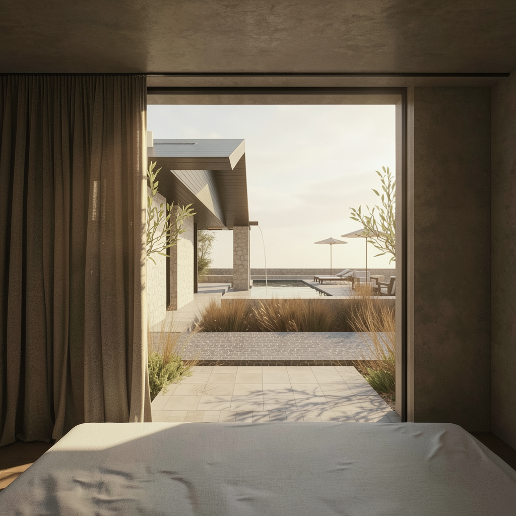 render a tranquil modern bedroom overlooking a luxurious poolside the room s interior features soft beige tones with a gently shadowed curtain in deep charcoal gray through the open sliding glass doors the scene reveals a serene pool area bathed in warm sunlight with clear azure water reflecting the sky the poolside is framed by stone walls in soft tan and a sleek modern roof in slate gray the outdoor furniture including deck chairs and an umbrella are in rich brown tones adding warmth lush greenery and grass border the area providing fresh accents of vibrant green the atmosphere is peaceful and inviting evoking a sense of relaxation and luxury