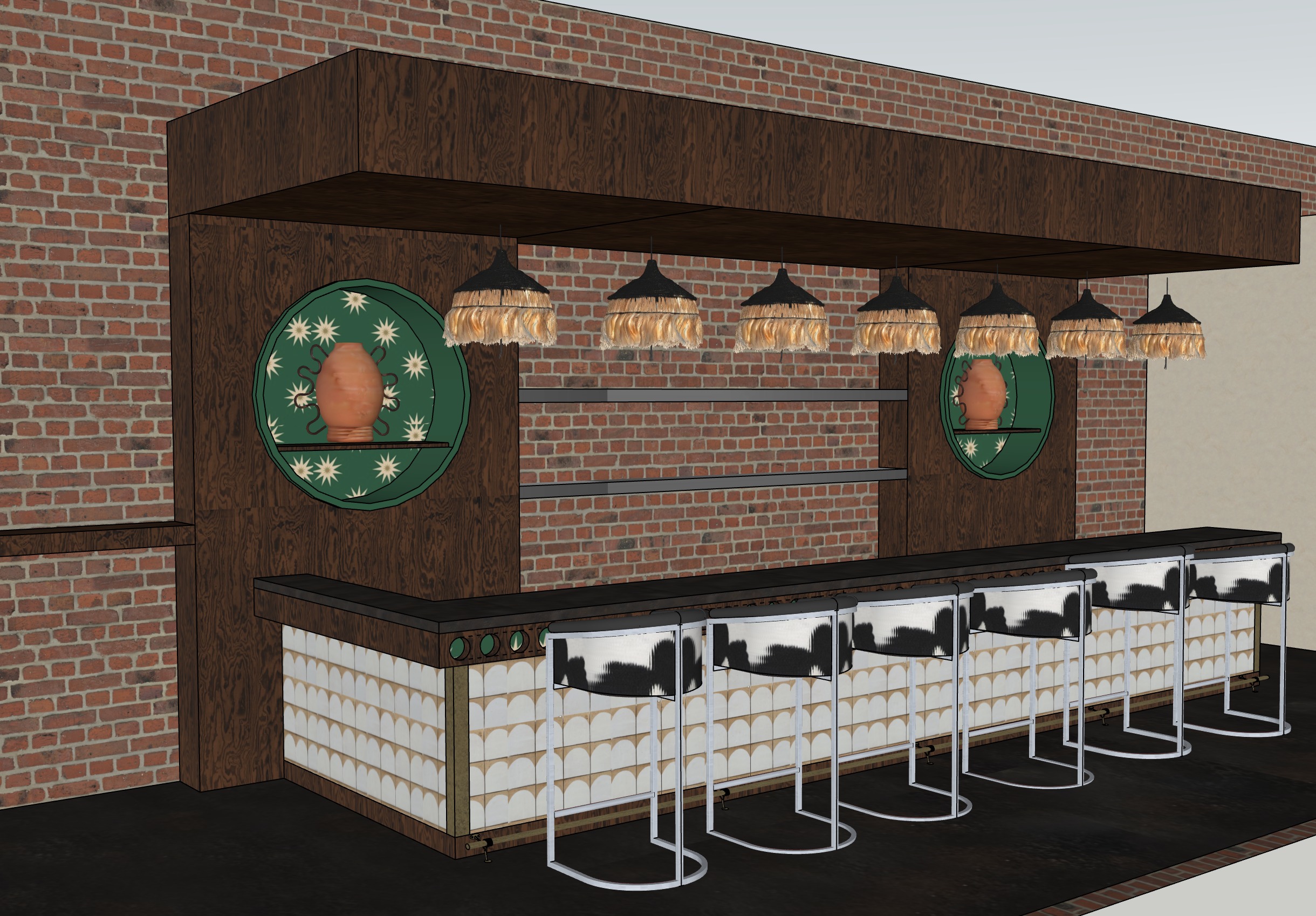 transform the provided restaurant interior image into a high end photorealistic render with evening atmosphere soft glowing highlights and relaxed upscale energy while keeping everything exactly the same same proportions same bar shape same booth seating same there are modern stylish people sitting at the bar enjoying a glass of wine while the modern good looking bartender works