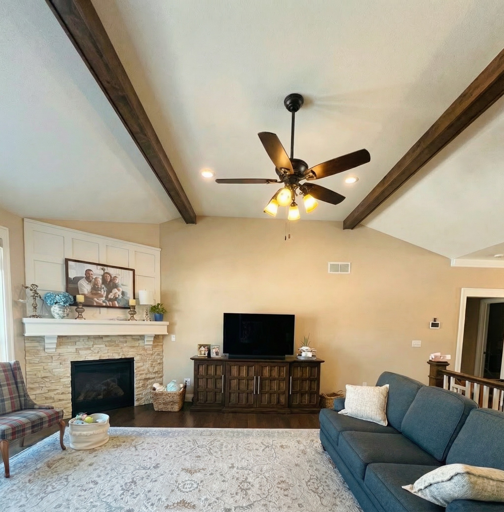 remove the plaid chair make the stone on the fireplace have more dark and light stones more variation