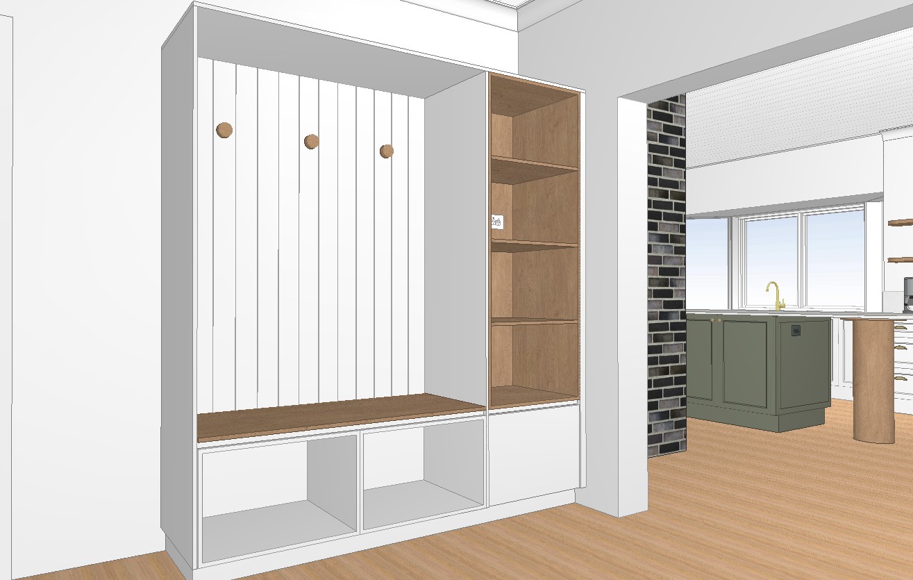 add decor natural light coming through space and add someone sitting on the bench seat make cabinets below bench open