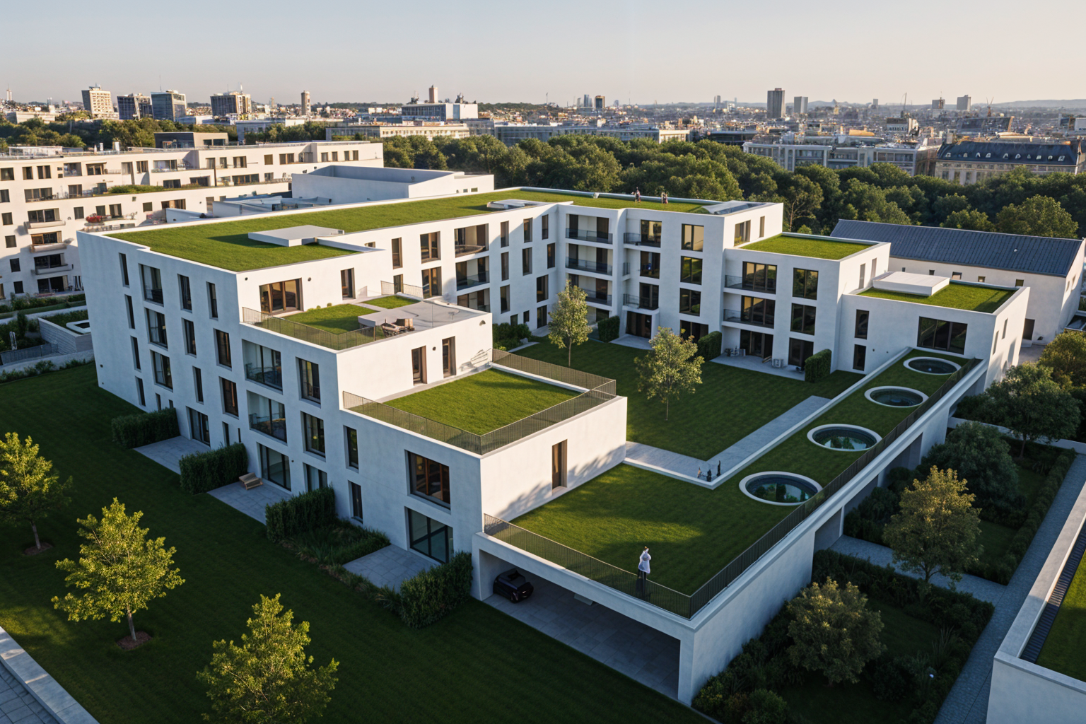 le corbusier aerial shot the modernist white building is surrounded by low greenery lawn and small trees the building s facade is white plaster with balconies and dark balustrades big windows on elevation grass on a roof architecture