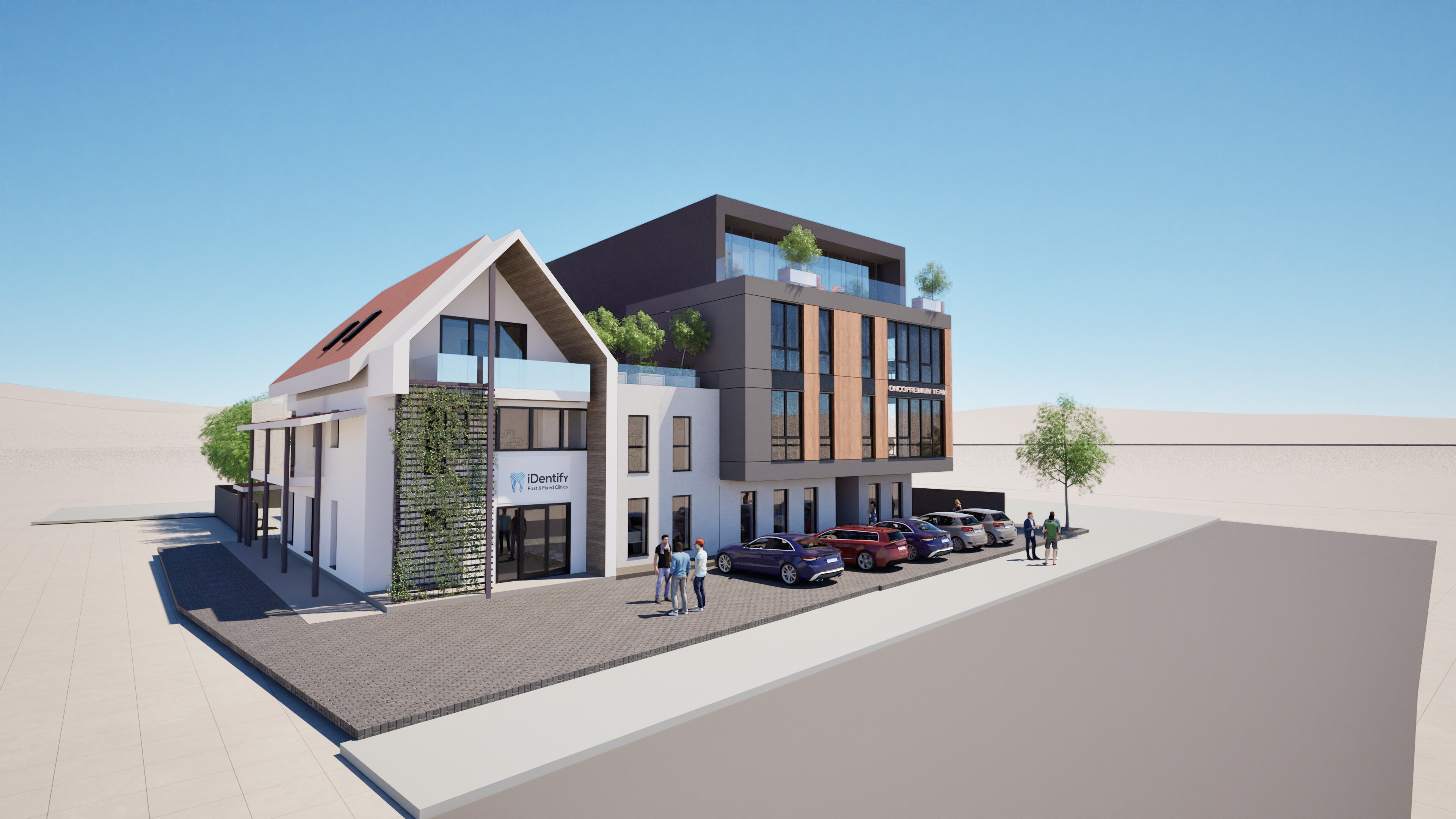 exterior shot overlay the images in the street context maintaining the proportions improve the sidewalk texture and keep the traffic lanes of the street keep the building in the original picture and insert it into the context of the moodboard adjust the vanishing angle of the original image so that it matches the one in the moodboard
