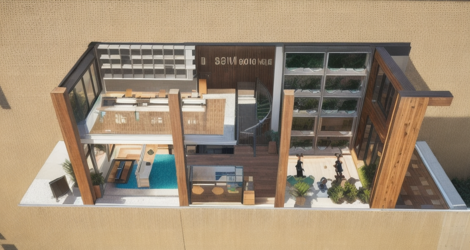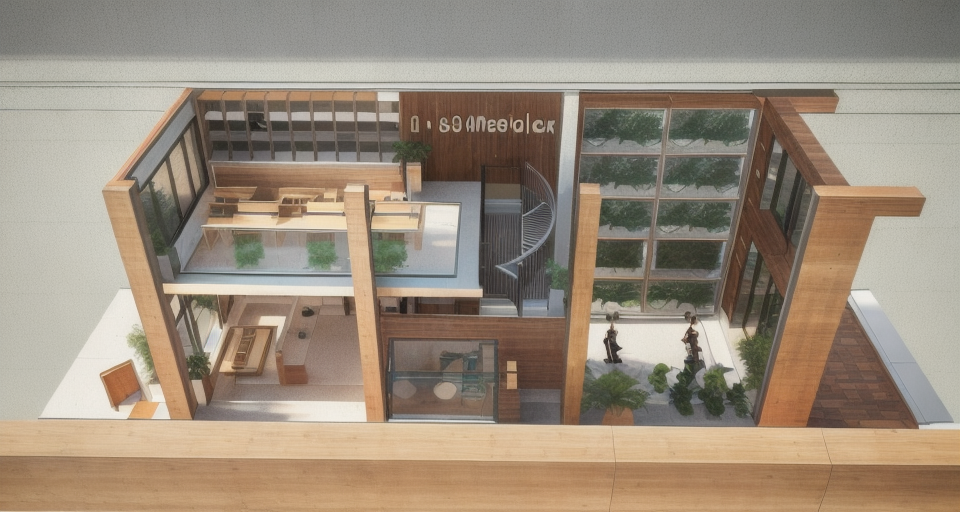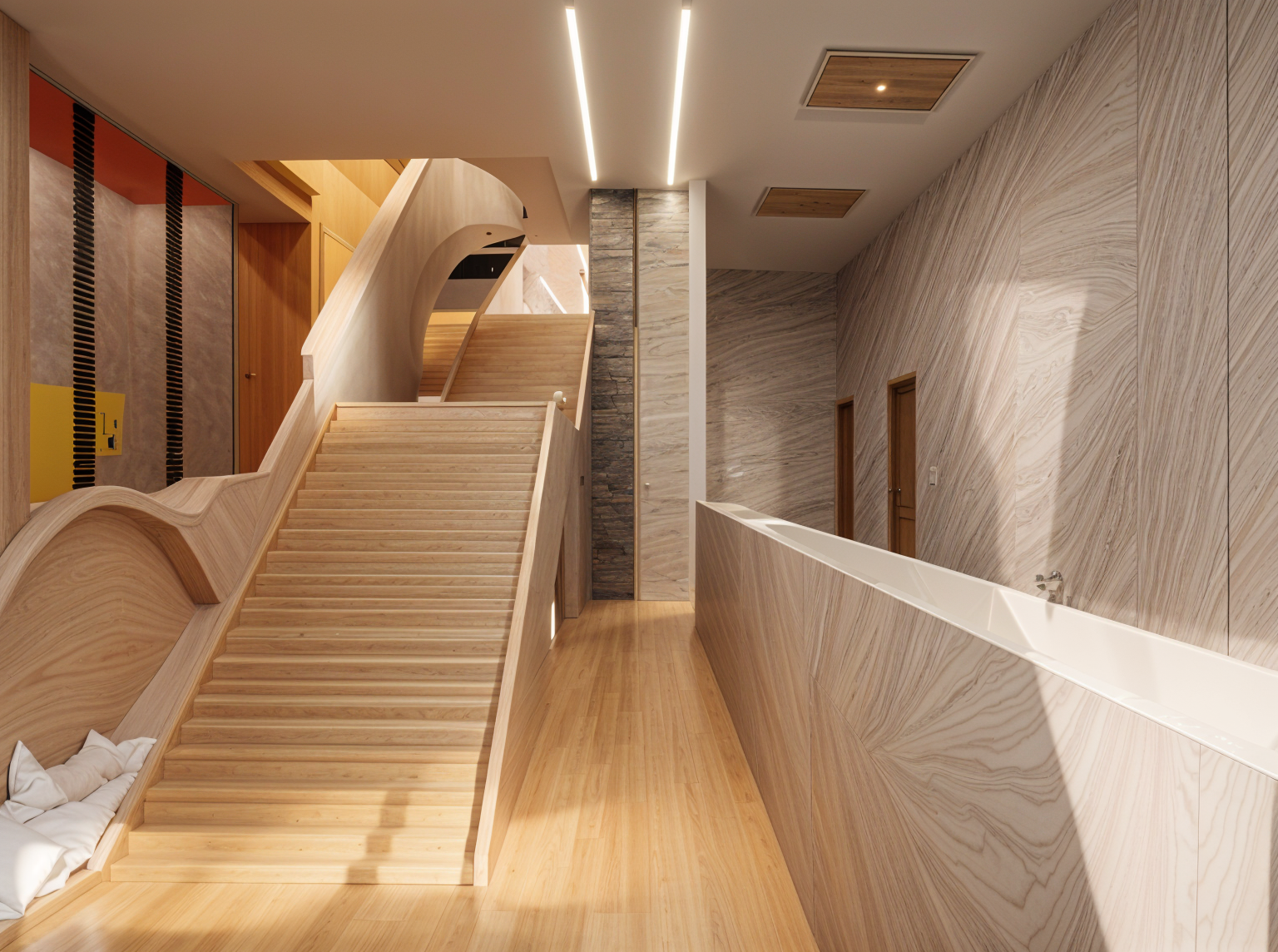 modernist exterior shot modern coworking makerspace coding robotics warm morning light ambience light tones wooden details architecture