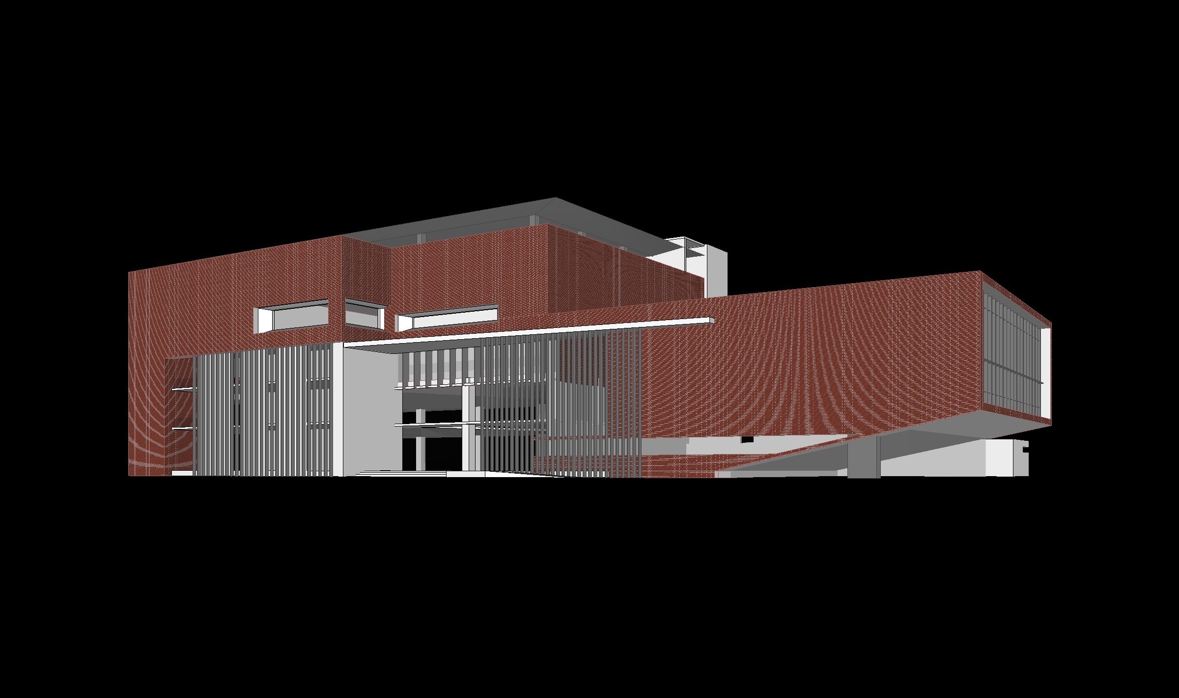 detail shot render a modern architectural building with a contemporary design the building should have sleek red brick walls accented with white and grey concrete details for contrast the windows are large and clean allowing natural light to filter through gracefully create an atmosphere of a clear sunny day with soft sunlight illuminating the structure casting gentle shadows include a vibrant blue sky as the backdrop to enhance the overall aesthetic of the building architecture