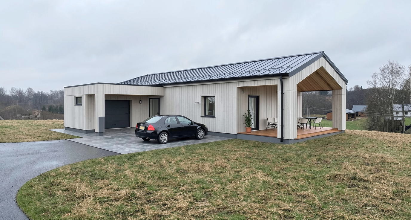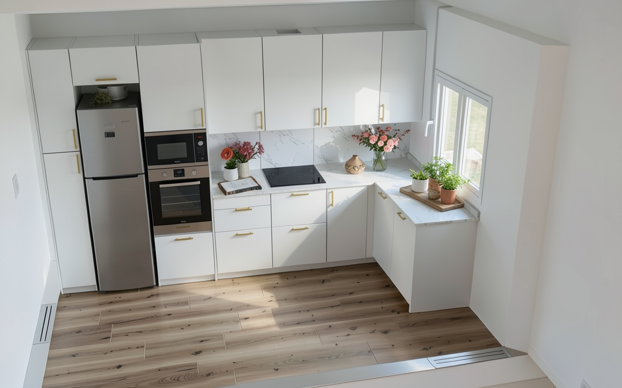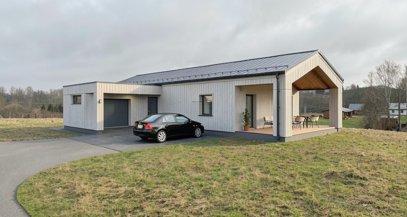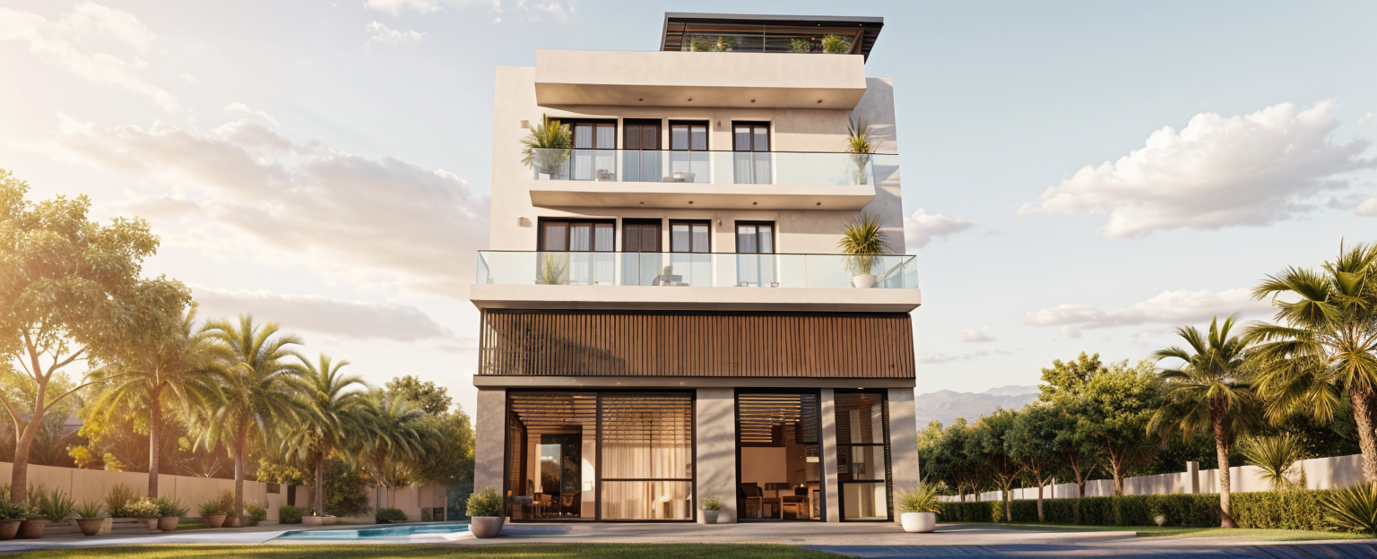generate a photo realistic rendering based on the image add minimal accessories keep resemblance brighten the image add blinds on the windows architecture