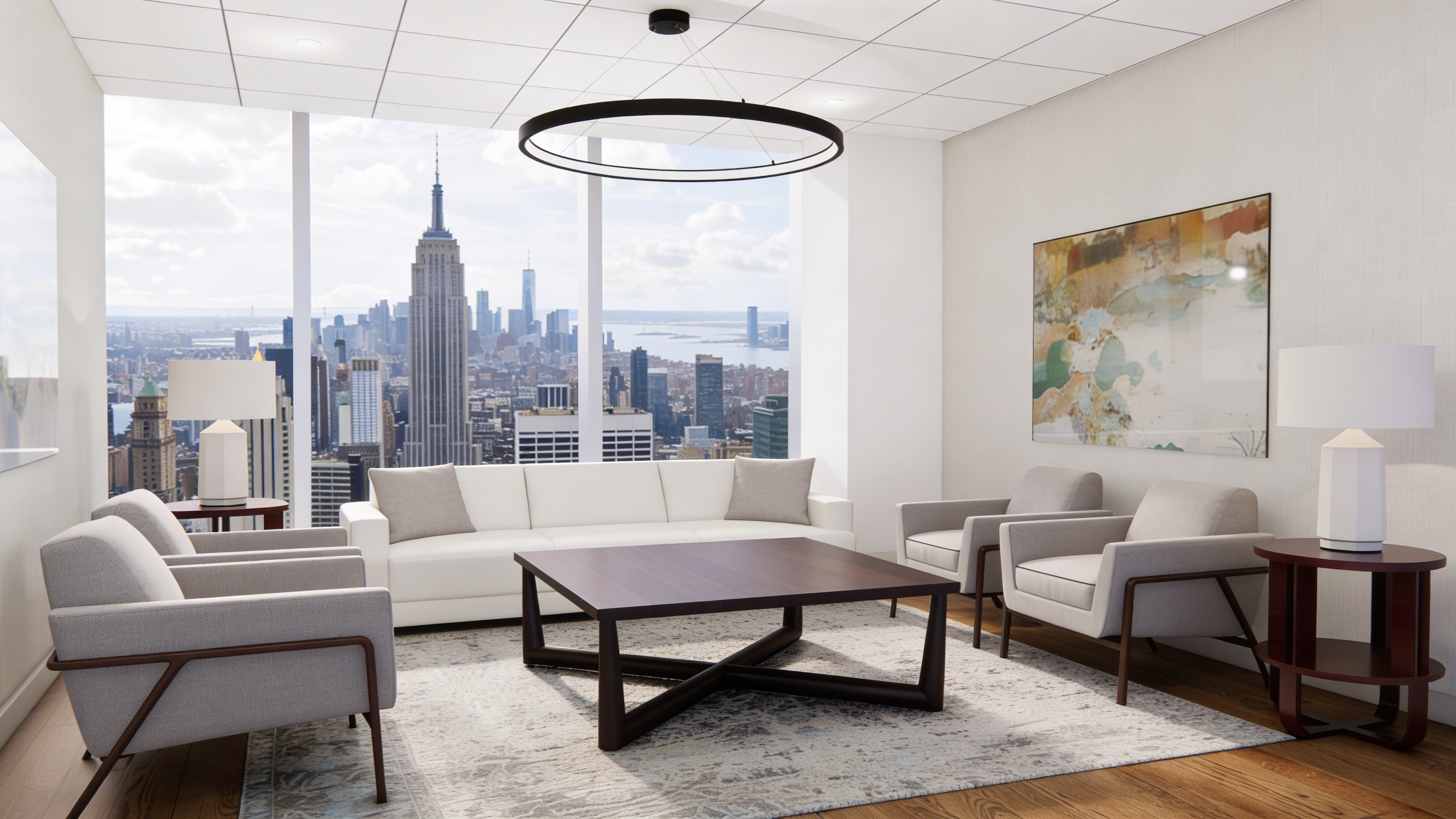 create a photorealistic rendering keep all the elements proportions and finishes as they are change the color of the two table lamp bases to a brown and leave the lamp shades as is