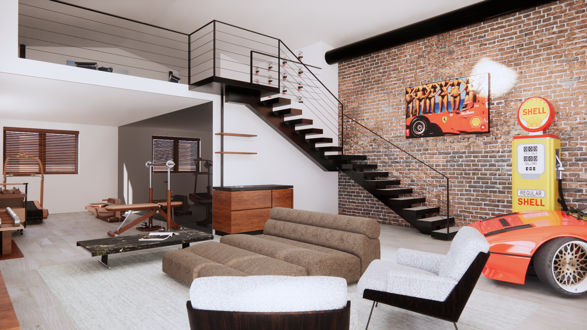 modern industrial loft interior double height living space with exposed brick accent wall floating black steel staircase with cable railing leading to mezzanine minimalist open plan layout warm natural lighting through wooden venetian blinds mid century modern furniture including low profile textured sofa sculptural lounge chairs and marble coffee table fitness corner with vintage style workout equipment on dark platform automotive inspired decor red ferrari wall art retro shell gas pump and partial classic sports car in foreground neutral palette with warm wood tones black metal accents and soft textiles polished light wood flooring clean architectural lines ultra realistic high detail cinematic lighting 4k render