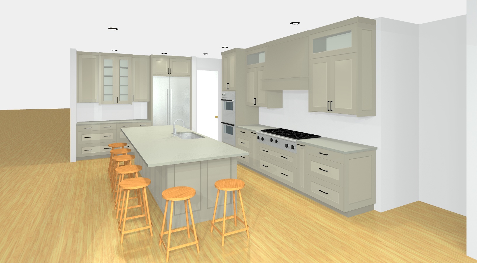 white walls and a granite top with a white subway tile backsplash light grey cabinets with a simple black handle rustic white oak flooring warm colored wooden bar stools interior cabinet lighting and under cabinet lighting