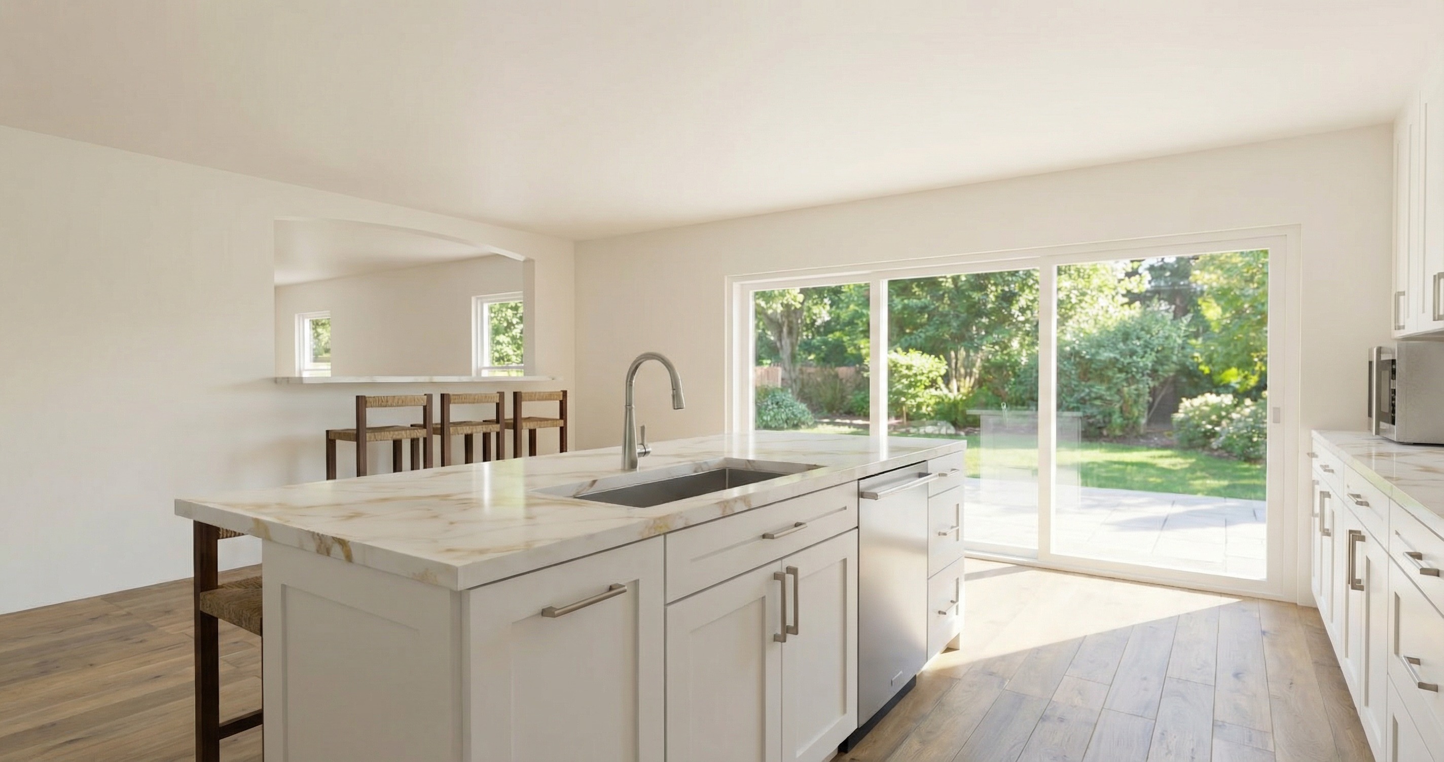 remove the windows in the other room not in the kitchen and make just white wall