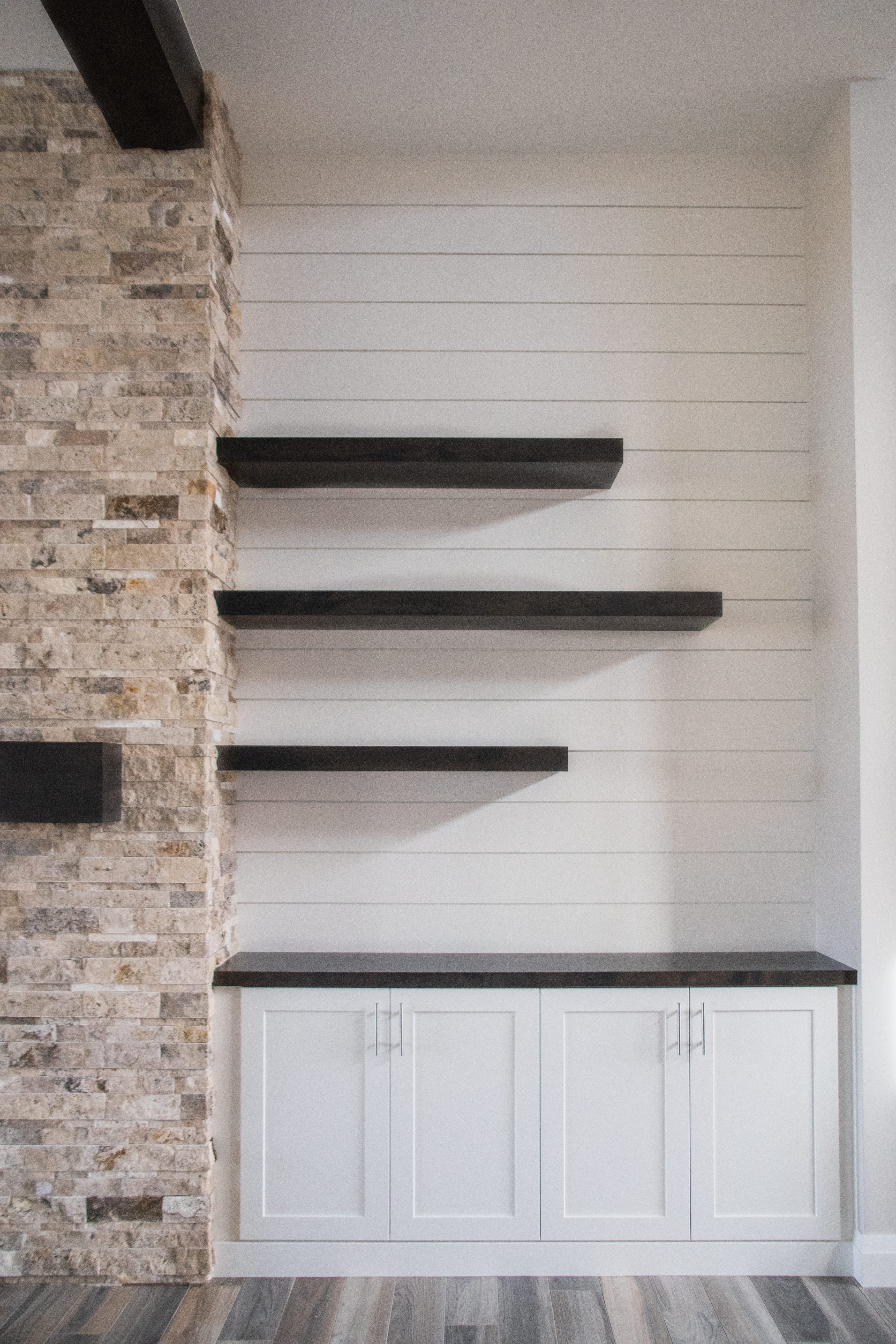stage the shelves and countertop with modern minimal flare