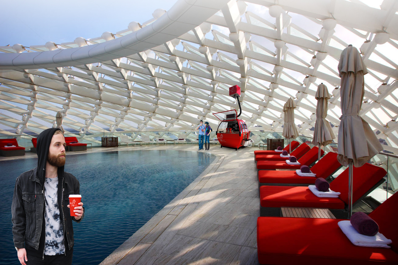 important preserve the existing geometry and the existing context exactly as provided preserve the existing windows do not add new windows do not modify alter reinterpret add remove scale or reshape any geometry do not change the site surroundings street layout neighboring buildings vegetation or context elements do not modify geometry scale proportions buildings road layout sidewalks or surrounding context in any way do not modify text soft midday atmosphere diffused neutral natural daylight with subtle cold tones cinematic architectural mood subtle environmental reflections of sky and surroundings do not modify the text remove the people remove the car do not add fog important do not remove the gondola make the sunlight more bright add people with motion blur