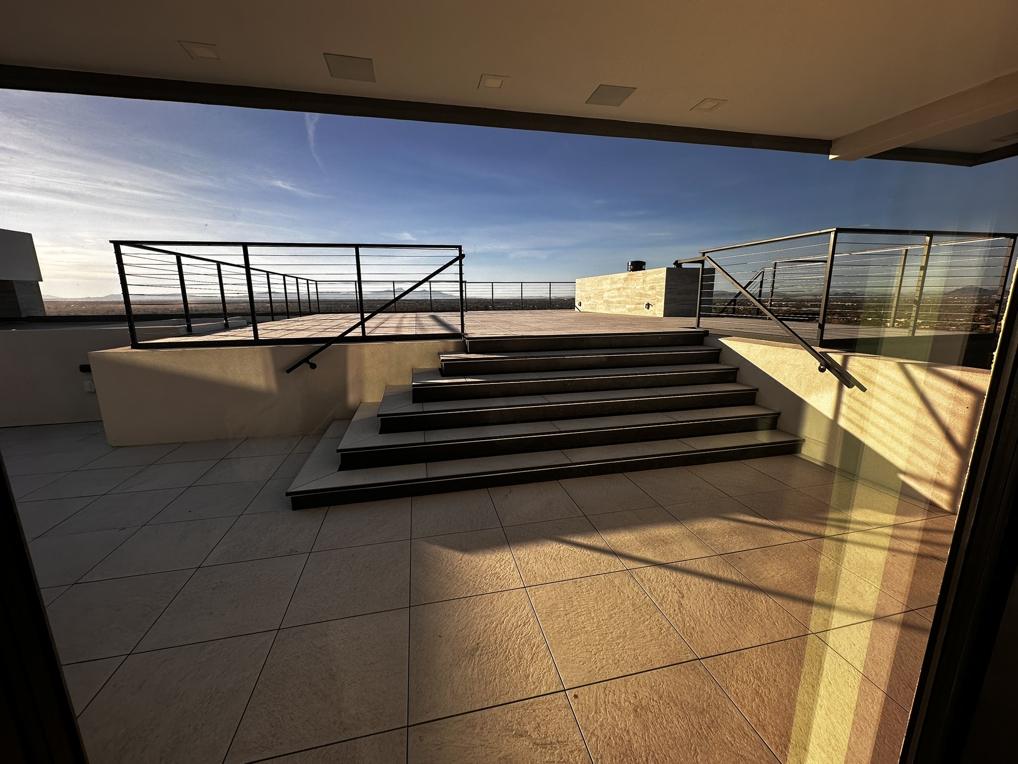 add a sitting area at the top deck use furniture that is made of wood and colorful cushions with people enjoying the view make the sky a night sky and the sun the moon add low level lighting to the scene with use of candles and lanterns on tables