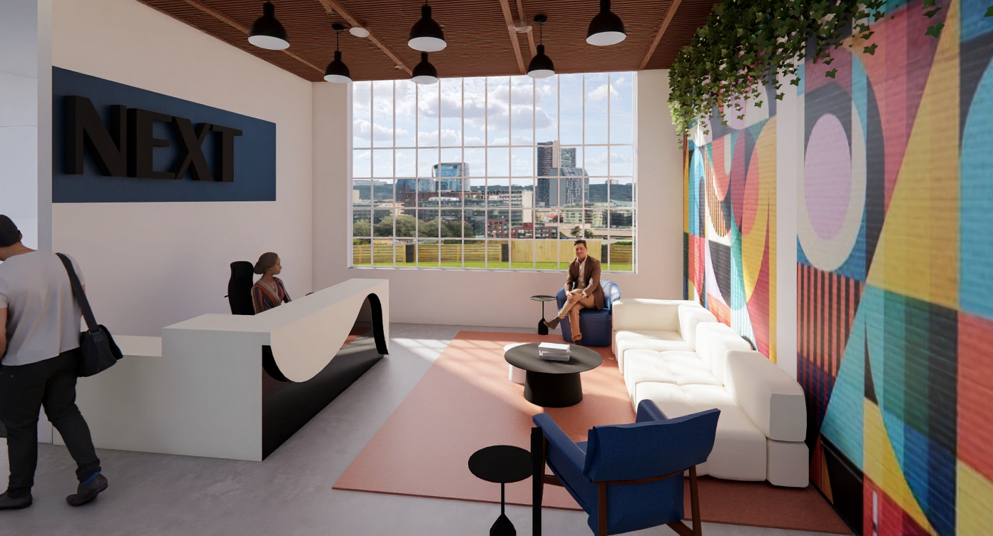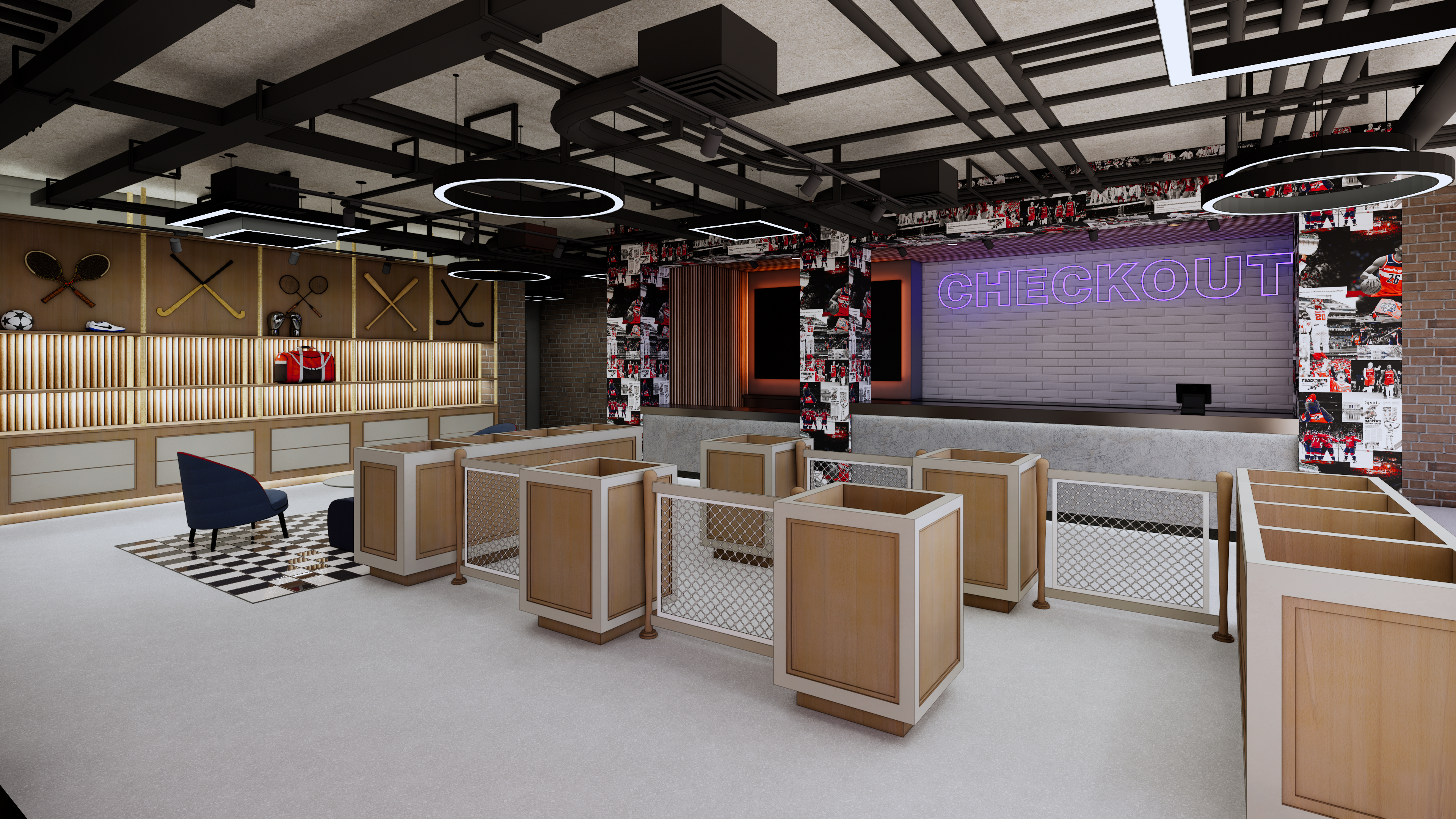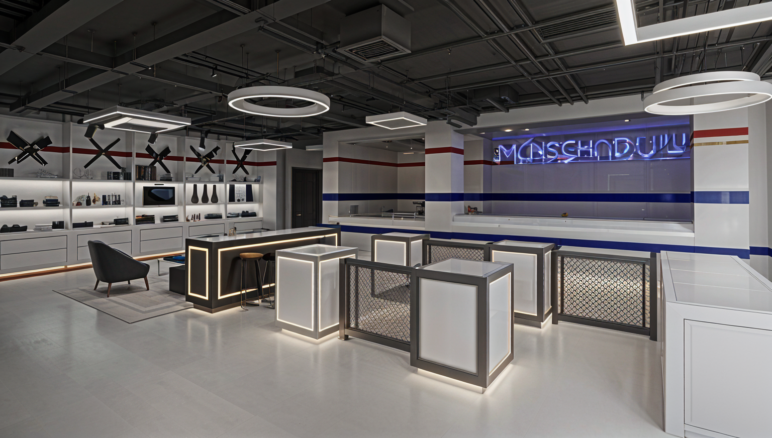 design a clean sculptural retail space with a fully exposed ceiling emphasizing the raw architectural character of the building while maintaining a high end minimal dc sports aesthetic the ceiling should reveal concrete structure ducts and electrical runs but all organized painted and detailed intentionally to feel purposeful rather than industrial all ceiling elements should be sprayed in a uniform warm white or deep charcoal to create a clean monolithic plane above the space integrate ultra linear led lighting that slices across the exposed structure like arena tunnel lighting precise controlled and minimal walls should remain crisp white or soft gray to feel gallery like avoid any mesh use smooth solids architectural planes and controlled pops of dc team inspired color through thin back painted glass bands or led accents retail fixtures should be monolithic matte black steel frames engineered stone or solid surface plinths and integrated lighting that elevates merchandise the overall feeling should be architectural confident and minimal like a modern gallery merged with a premium sports arena store grounded in dc monument inspired geometry