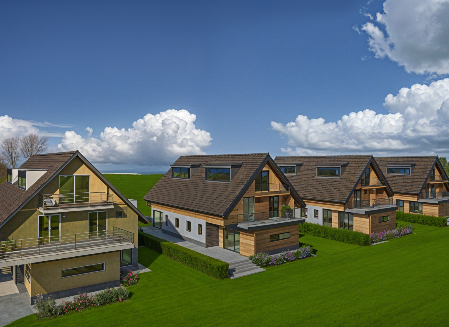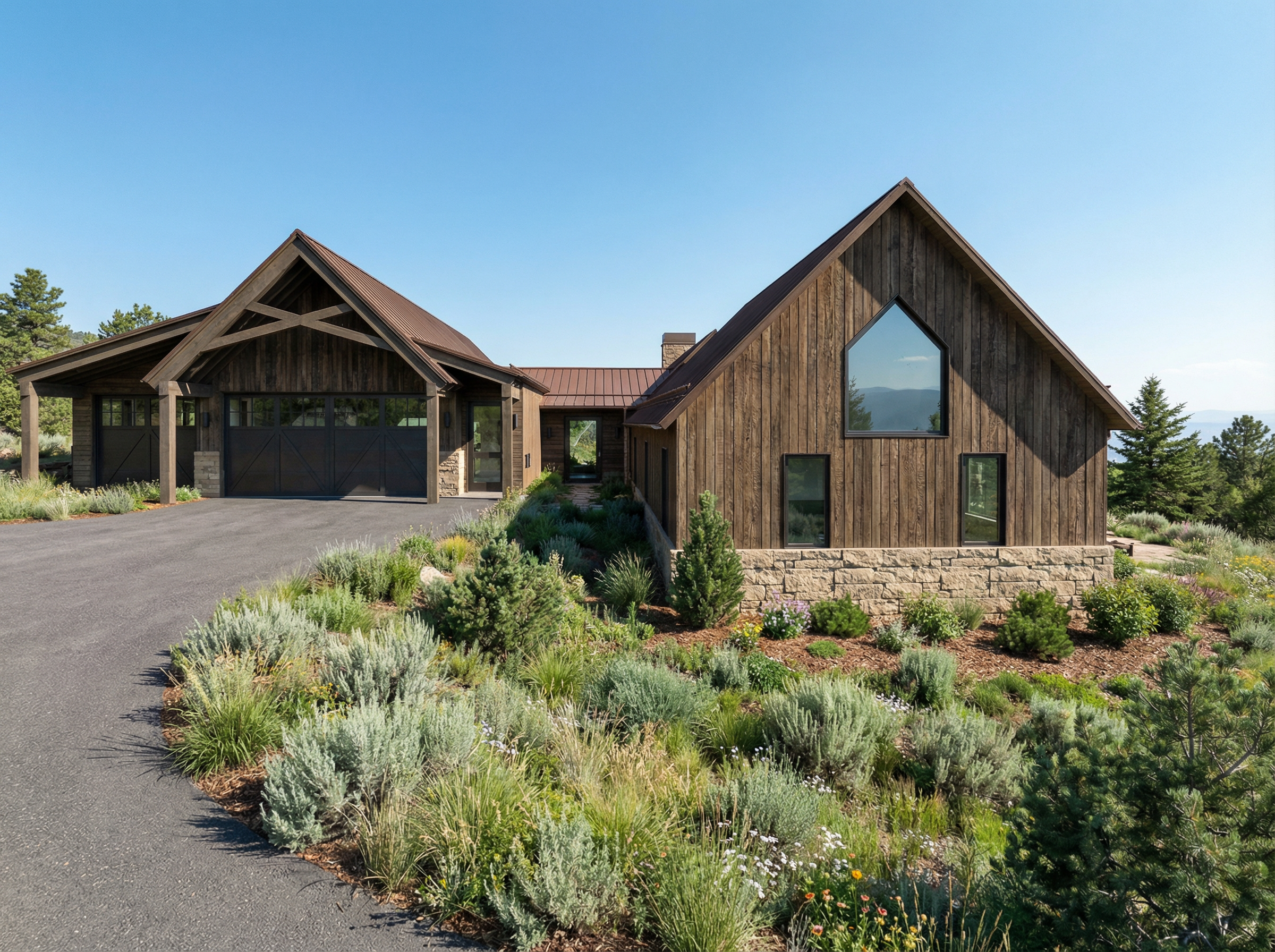 render a photorealistic 3d perspective of this house in a glenwood springs co reference the current material style just enhance them brown standing seam metal roof vertical and horizontal dark oak solid wood siding colorado buff rough face limestone half walls where shown keep model geometry the same windows doors roof walls garage door pavement driveway make a lush vegetation that looks native to glenwood springs co do not change the view only enhance the current materials and make the landscape nicer vegetation detailed textures in the wood siding and glass reflections and a vibrant clear sky with light atmospheric depth render in hyper realistic architectural visualization quality 8k resolution