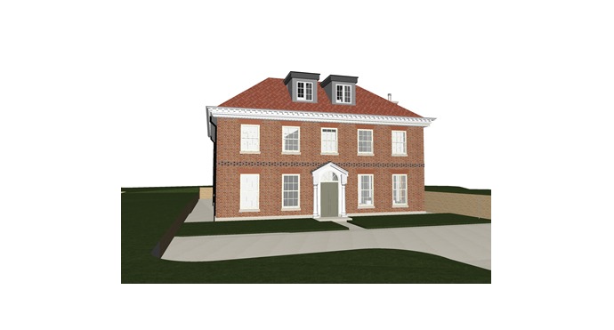 create a hyper realistic visual of this house do not change the design or house proportions make the driveway a cream resin finish and add classy wild planting flowers to the front garden and add cut stripes into the grass where possible add trees and planting in the background show the back brick on edge detail as per the original image