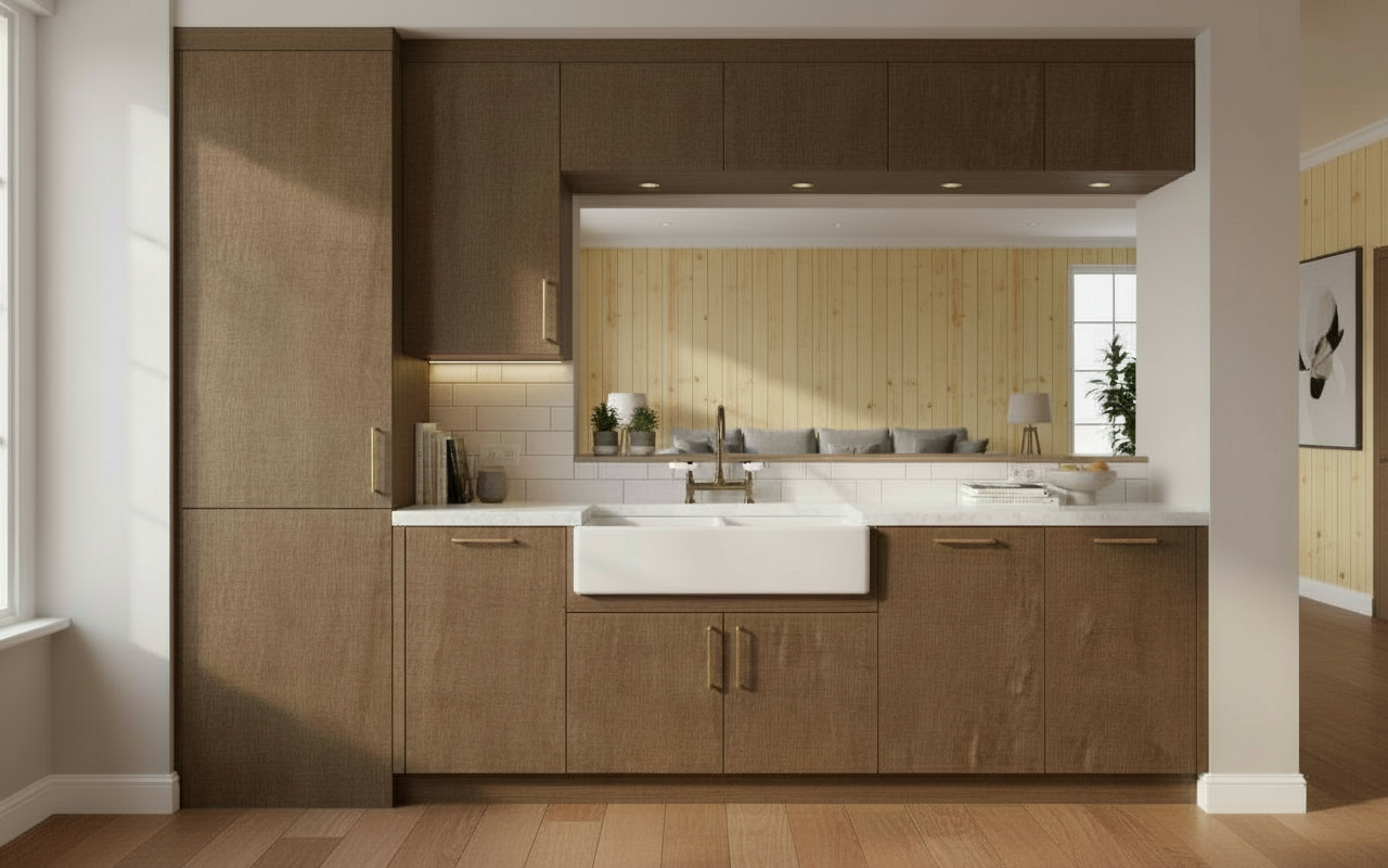 replace the cabinet wood to match the wood in the reference image
