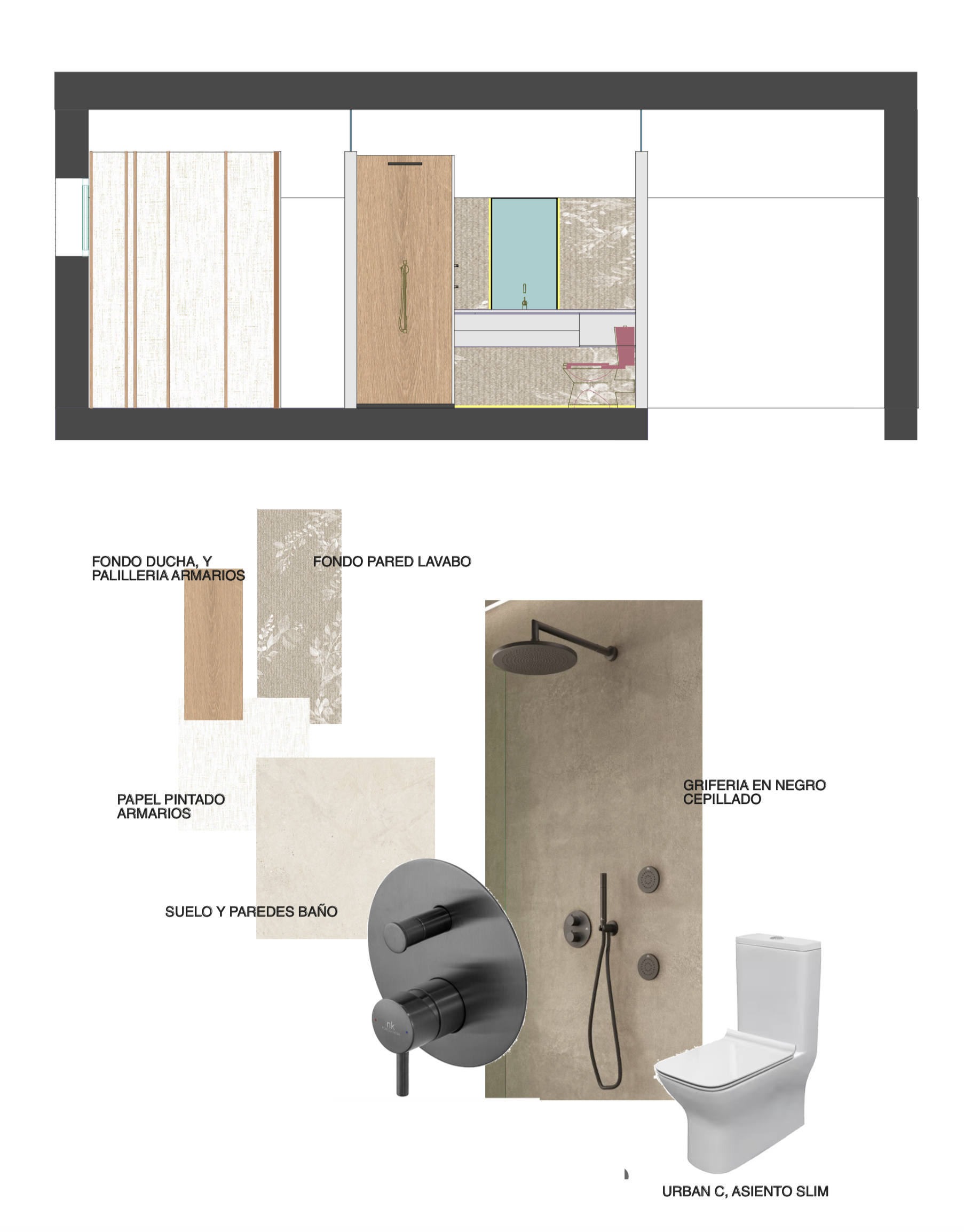 section perspective of mansard attic bathroom suite sloped ceiling with skylight walk in shower under slope with natural oak vertical slat partition beige textured stone effect porcelain tiles 60x120cm on walls and floor brushed black matte shower fixtures wall mounted rainfall head thermostatic mixer hand shower white modern toilet oak wood closet doors with vertical slats dressing area with pink velvet seating white floating platform with turquoise accent wall cream grasscloth wallpaper contemporary minimalist design soft natural daylight photorealistic architectural rendering warm neutral palette with black metal accents