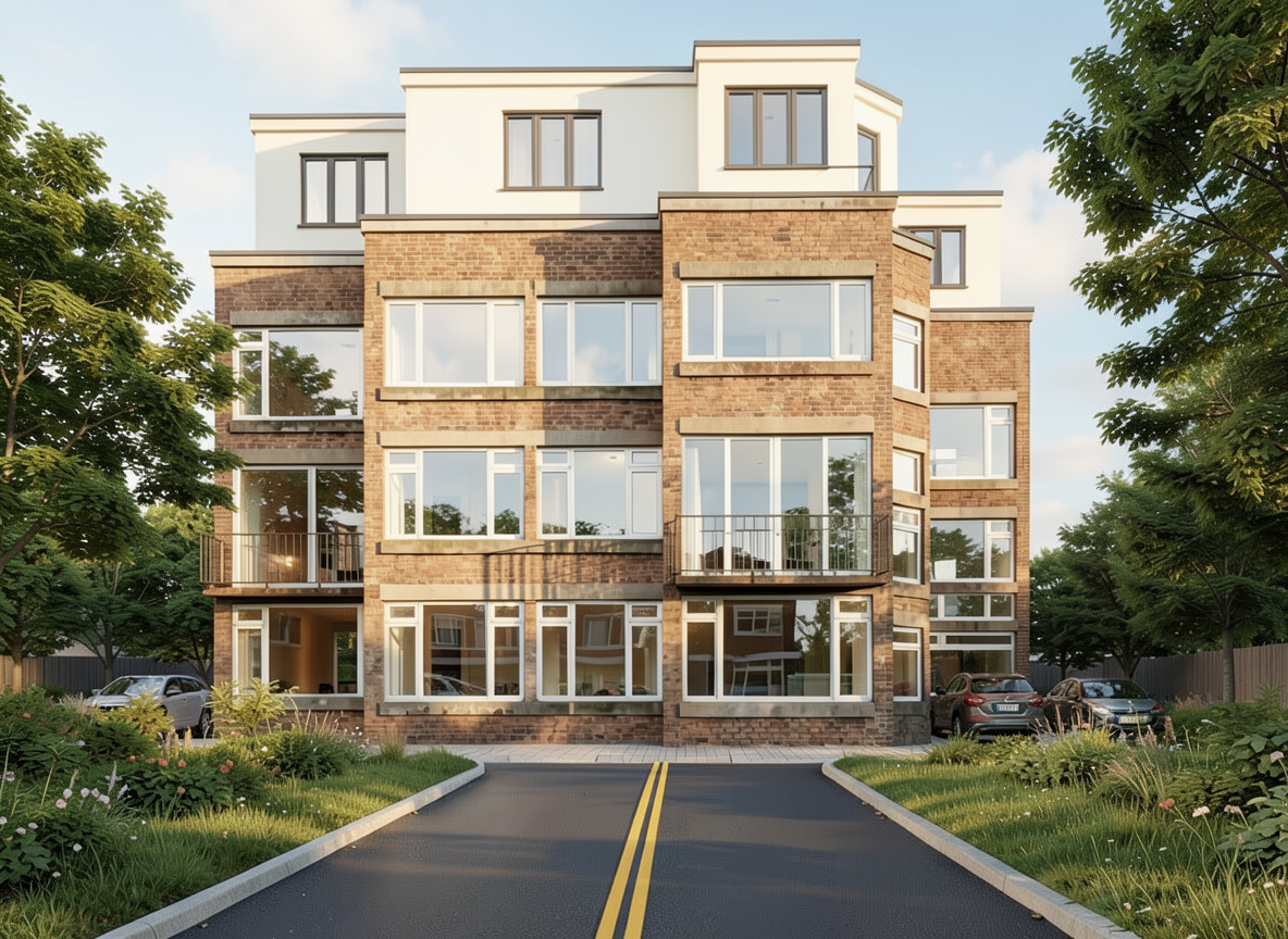 private normal area with a straight one way road and car park behind with a pavement