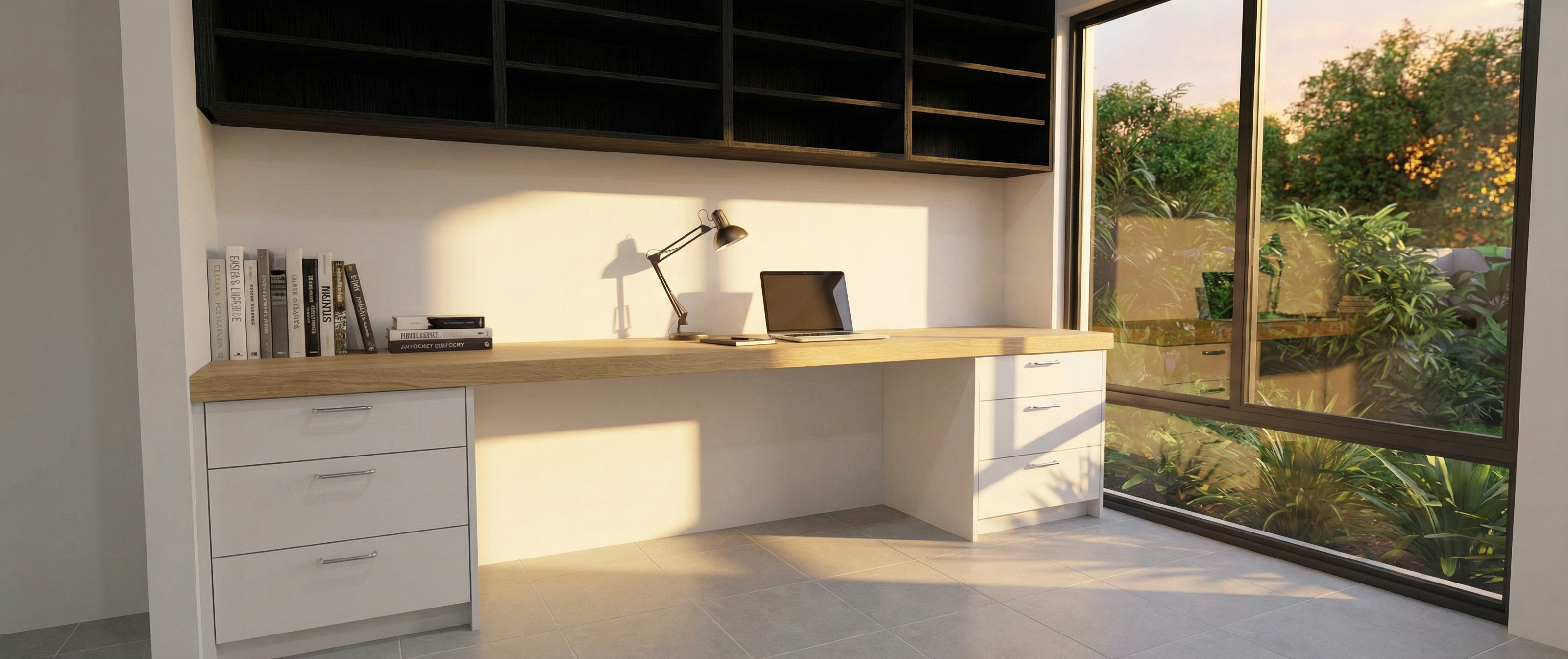 realistic image dusk sky outside turn on exterior and interior lights lush landscaping exterior walls whitewashed brick white painted panel columns white railings white frames at windows gray shake roof warmer lights more lush landscaping slightly lighter sky