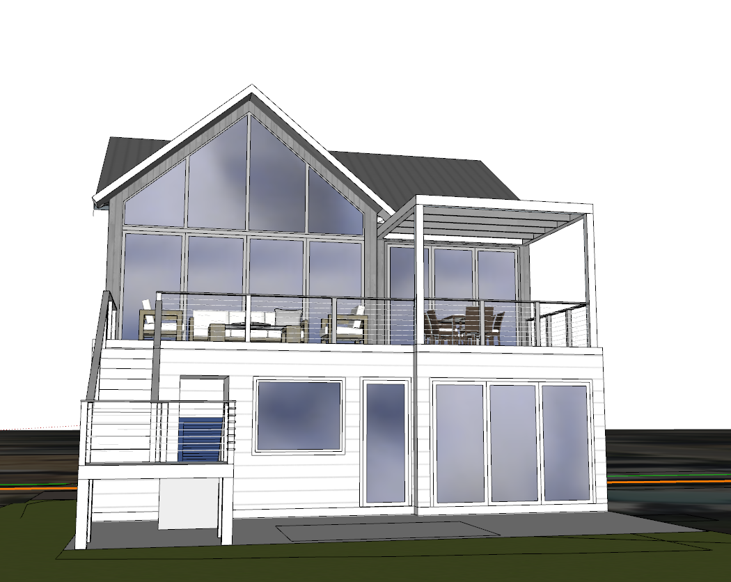 render a photorealistic modern two story house with large glass windows and a balcony the exterior walls are painted in a soft white the windows reflect a serene blue sky the roof is a light gray and the railings are metallic silver the front door is a bold navy blue the lawn is a lush green creating a peaceful and inviting atmosphere add soft warm lighting to enhance the cozy feel