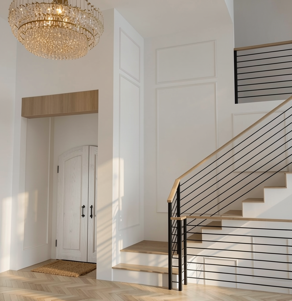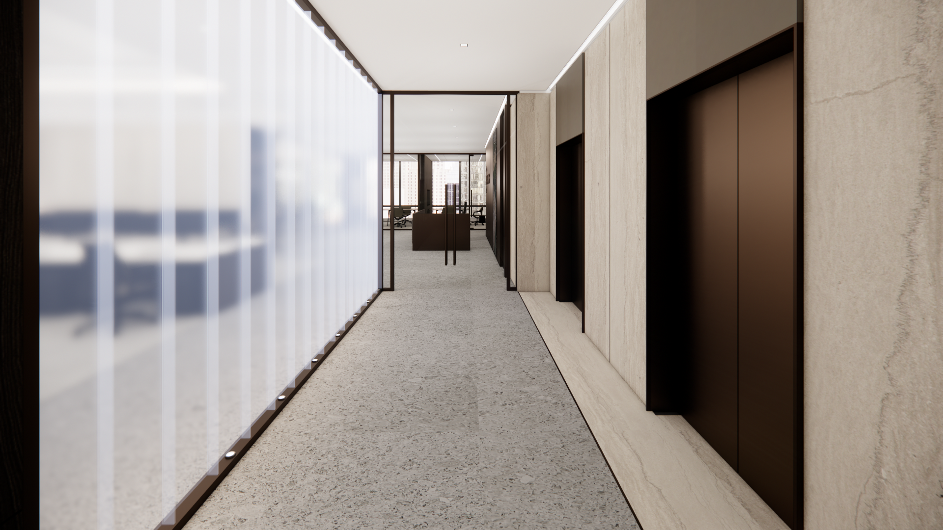 provide a photorealistic rendering keep all the elements proportions and materials as they are provide north daylight through the glass only add linear wall wash illumination at the elevator wall