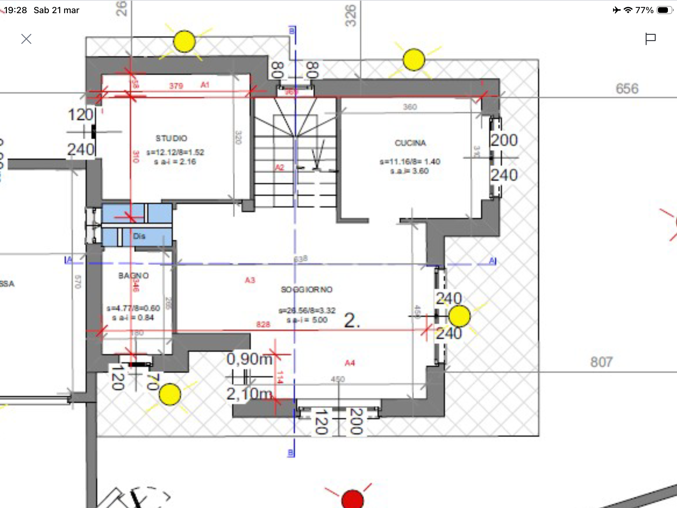 render a beautiful architectural floor plan of a modern home emphasize clean and precise lines utilizing a soft gray for the walls and a gentle white for the floor areas to depict the spaciousness highlight the key areas such as the studio cucina and soggiorno with a subtle pastel blue to create a harmonious contrast use a light yellow to depict light sources adding warmth and a sense of natural lighting include realistic textures like smooth wood for doors and elegant tiles for the bathroom with a light silver tone the overall atmosphere should be bright inviting and contemporary