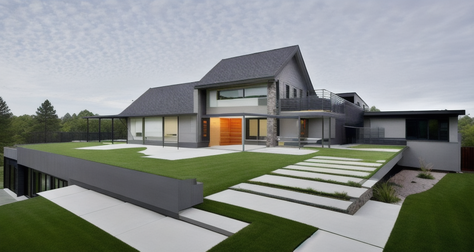 render a modern minimalist house with a bright white stucco exterior accented by light gray trim the roof is a soft terracotta color large arched windows with clear glass reflect the soft warm glow of the sunset sky the scene is bathed in golden hour light creating a serene tranquil atmosphere add lush greenery around the base with vibrant green grass and a few small bushes for a natural touch under a clear blue sky walway towards the entrance stone wainscott under windows round window above entrance rectangular columns at entrance