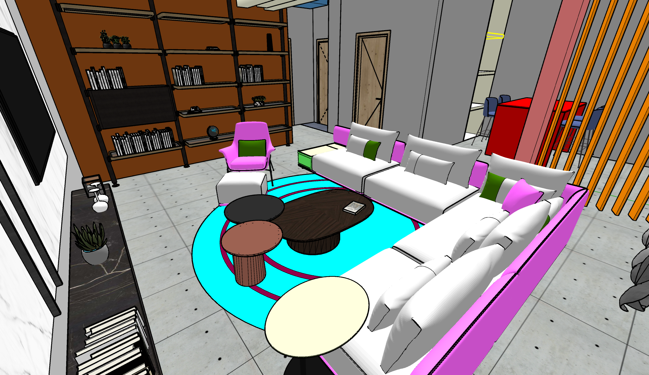 modernist interior shot a hyperrealistic interior scene of a modern luxury living room in daylight the layout and proportions must follow the reference apartment exactly the ceiling has soft sculptural curves with integrated led strips along the edges built in spotlights and a large modern ceiling light fixture above the main seating area include floor and table lamps placed naturally in corners or beside furniture a family or a couple can be present sitting reading walking in or talking but naturally integrated into the scene no posing key materials light oak or walnut floors boucle or linen sofa stone or wood coffee table brass or black metal accents scene includes cushions slightly misaligned a glass of water open book or remote control natural light coming through sheer curtains soft shadows bounce light on walls one or two indoor plants subtly placed everything must feel real and balanced as if photographed in a real apartment no cgi effect camera depth and realistic lighting required modern italian style minimalism in details lighting etc add leather to sofa remove people add colors that go well in anyinterior avoid too colorful tones of beige black and maybe green architecture