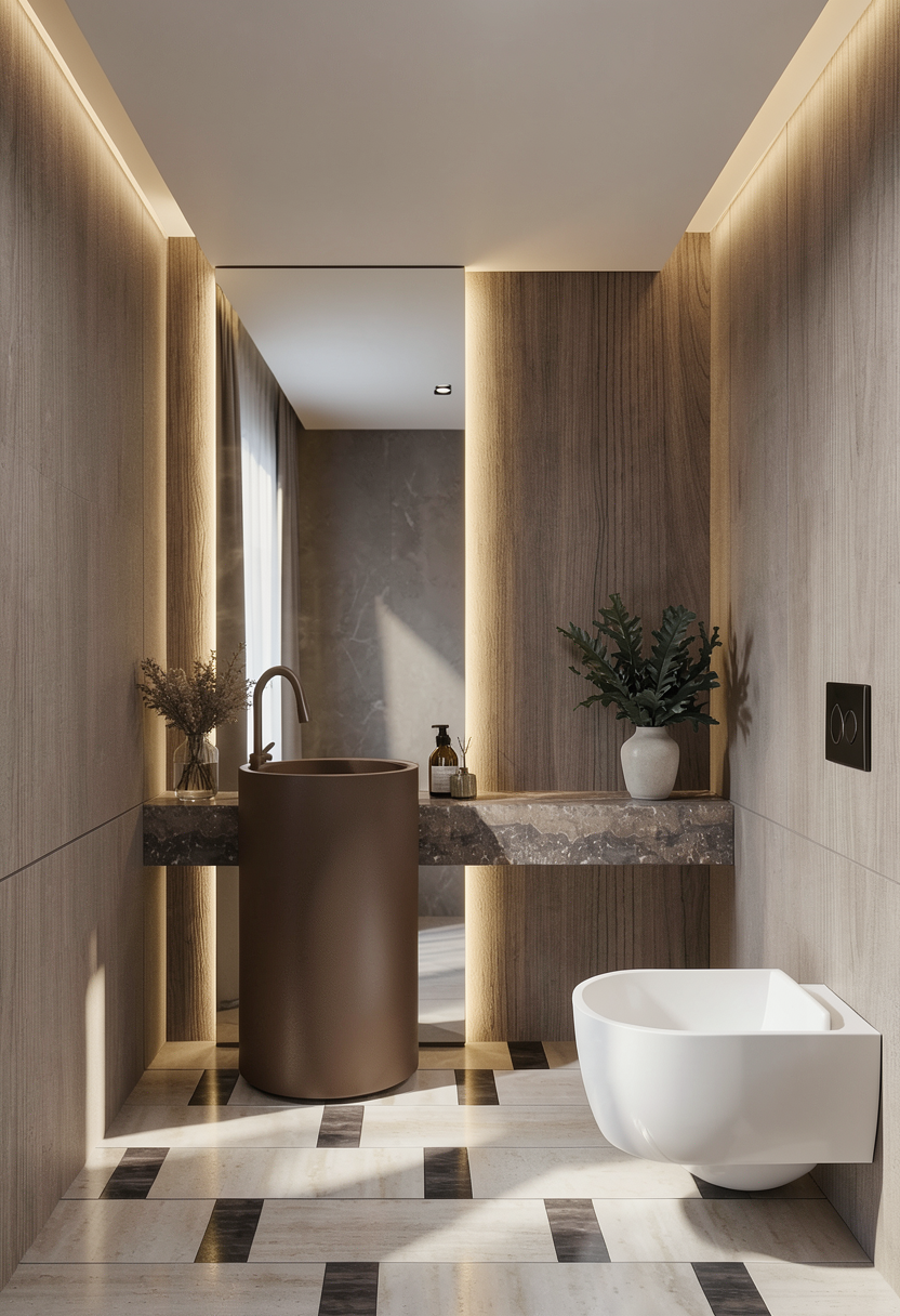 le pareti sono intonacate bianco caldo intonaco con texture come muri esterni mantieni tessuto testata letto specchio dietro nicchia libri e vasi mantieni colori vasi immagine ma lucidi comodini laccati lucidi rosso ruggine scuro mantieni design luci lettura finitura metallo marrone ceramica lavabo rosso ruggine scura lucida legno rovere come texture immagine leggermente spazzolato mantieni texture immagine a pavimento fai entrare luce dalla finestra laterale della camera fai entrare luce dalla velux del bagno mobile bagno laccato opaco verde salvia mantieni legno dietro la testata letto accendi luci specchio solo come fondo nicchie vasi e libri