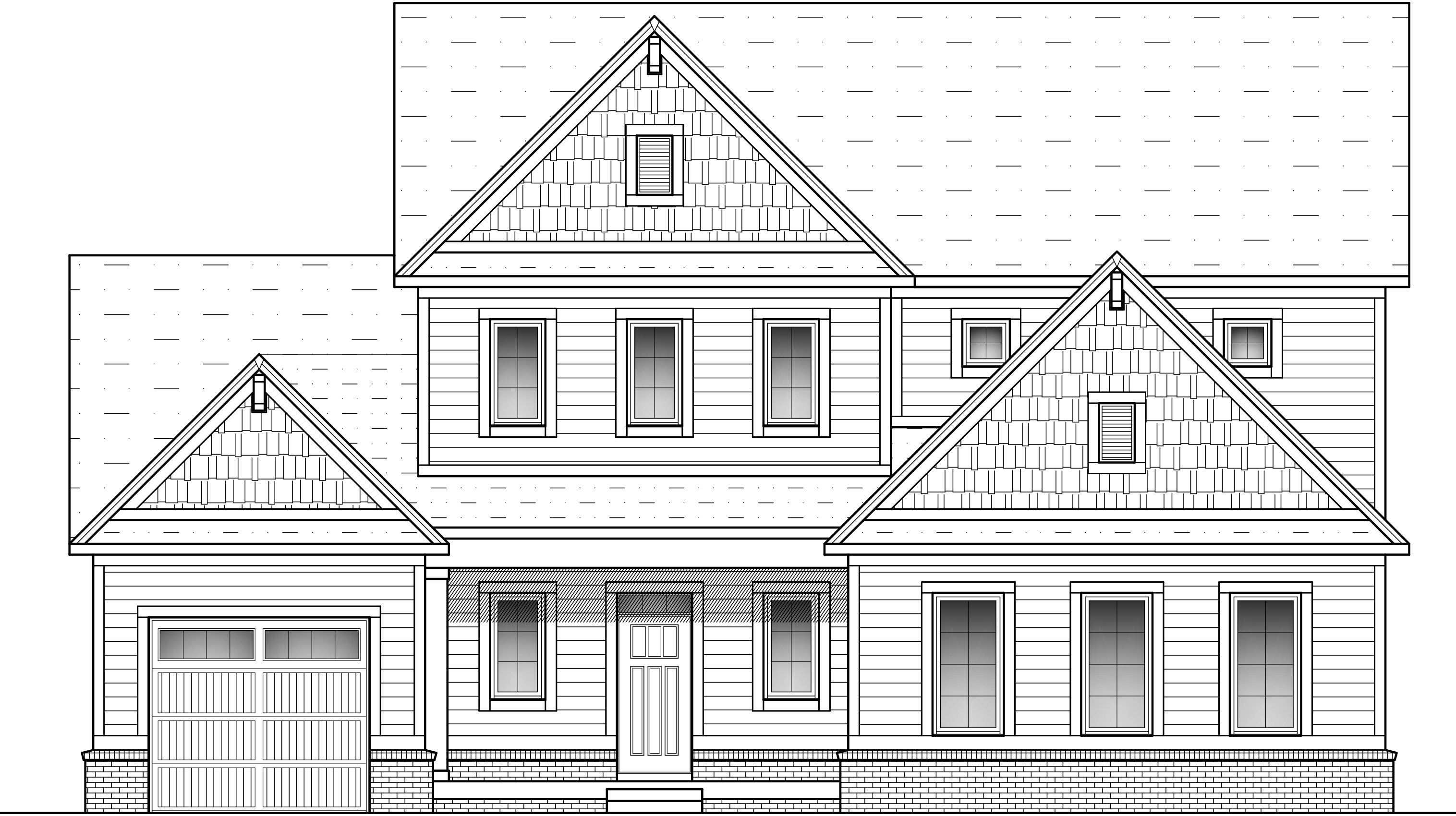 generate a high quality photorealistic 4k render of the provided architectural elevation drawing preserve exact geometry window spacing proportions and material layout from the drawing apply ultra realistic daylight lighting clear sky soft shadows ambient reflections with accurate photometric calibration for true color fidelity render the home with all materials exactly per the client s color list no brick added anywhere in this design extend the right side volume of the house forward by 20 feet beyond the main fa ade aligning it visually with the left side facing two car garage this extension should clearly project ahead of the central portion of the house render the driveway to show distinct access one section leading to the forward facing single car garage another section extending laterally to the left side facing two car garage material and color specifications body pewter green sw6208 trim alabaster sw7008 windows white front door ripe olive sw6209 roof moire black gutters black lighting and environment use hdri based global illumination with a warm afternoon sunlight tone ensure physically correct exposure color balance and soft directional shadows context elements include realistic suburban landscaping green lawn shrubs and lightly shadowed trees add a continuous concrete driveway and walkway connecting to all garage doors use a sky background consistent with the lighting direction free from overexposure or distortion output a single landscape oriented photorealistic rendering that is architecturally accurate visually balanced and precisely color calibrated