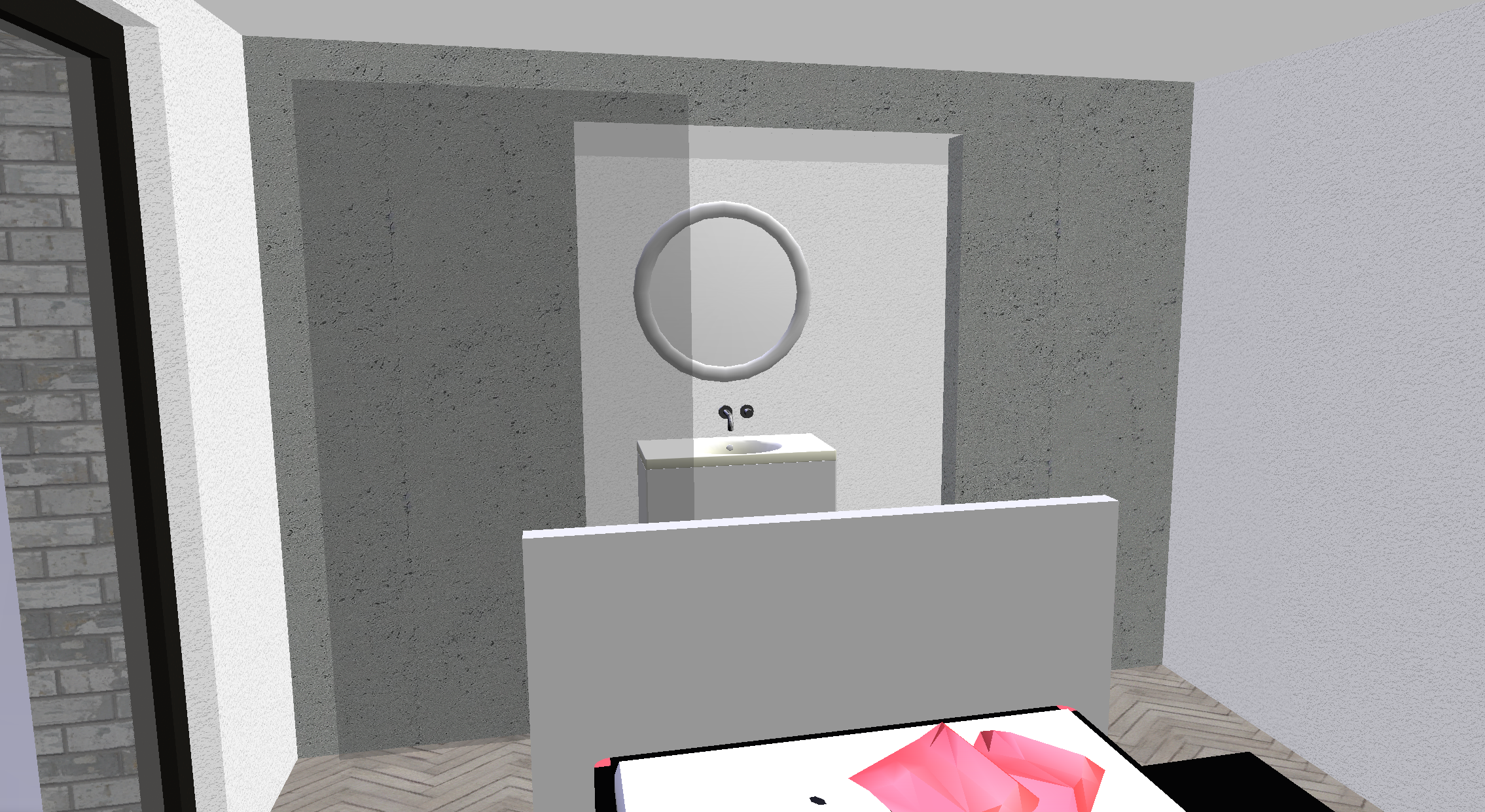 genau dieses rendering berarbeiten fotorealistisches innenraum foto exakt dieselbe perspektive und kameraposition wie das hochgeladene referenzbild 100 identische raumgeometrie exakt gleiche m belanordnung exakt gleiche verlegeart und richtung von parket und platten wie vorlage parket ruhig und hellgrau weiches nat rliches tageslicht raum k nstlich ausleuchten sanfte realistische schatten realistische materialien stoff mit leichten gebrauchsspuren hochwertige oberfl chenreflexionen lavabo komplett aus marmor collemandina grigio in braungrau dunkel lavabo innen ebenfalls collemandina im unterbau im obersten drittel eine griffmulde ber die ganze breite ganzer unterbau in collemandina unterbaum bel mit unterbaubeleuchtung dahinter eine gessi wandarmatur edelstahl vollkommen rahmenloser und hinterleuchteter spiegel mit echten spiegelungen alle sichtbaren w nde sind sichtbeton schwarze steckdose rechts vom lavabo auf gleicher h he wie die armaturen schwarze runde deckenspots im bad und im zimmer bett wie vorlage modern mit kopfteil aus beigem abgestepptem stoffbezug mittig im raum parket im zimmer ruhig und hellgrau boden im badbereich collemandina grigio in braungrau links vor der wand zum bad ein grau get ntes durchscheinendes glas zum schieben an grossen rollen aus edelstahl oben ber die ganze breite aufgeh ngt gr sse die dunklere fl che in der vorlage fassade aussen aus hellgrauem klinker sehr moderner minimalistischer look nat rliche farbwiedergabe golden hour feeling hell ausleuchten das bild muss wie eine professionelle fotografie aussehen es soll ein echtes und reales foto sein canon eos r5 35 mm festbrennweite f 2 8 hyperrealistisch dslr qualit t raw aufnahme 8k aufl sung extrem scharf perfekte tiefensch rfe professionelle architekturfotografie