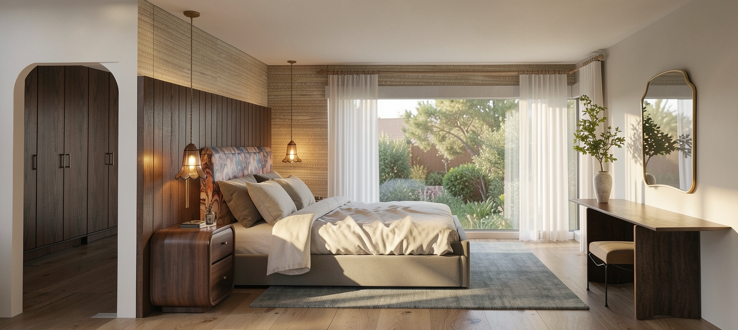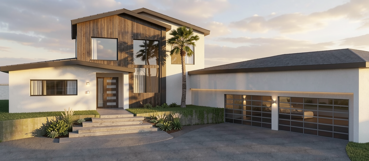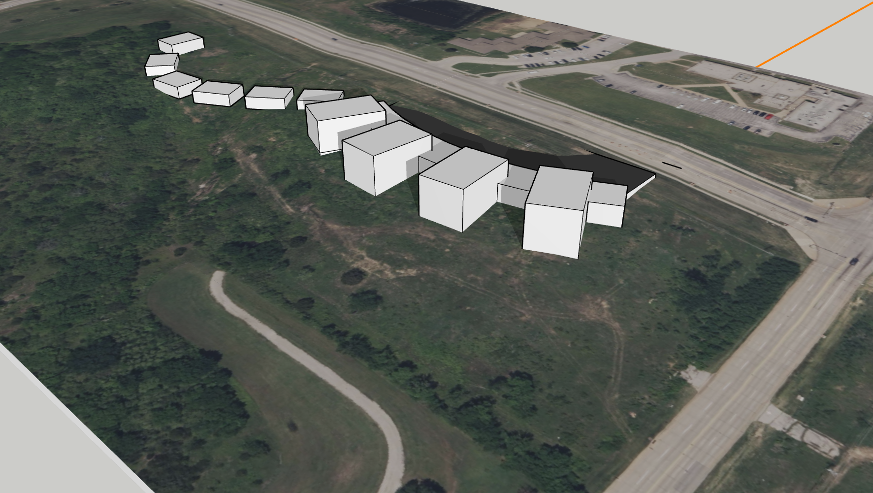 multifamily building with adjacent bungalow duplexes on a sloped site