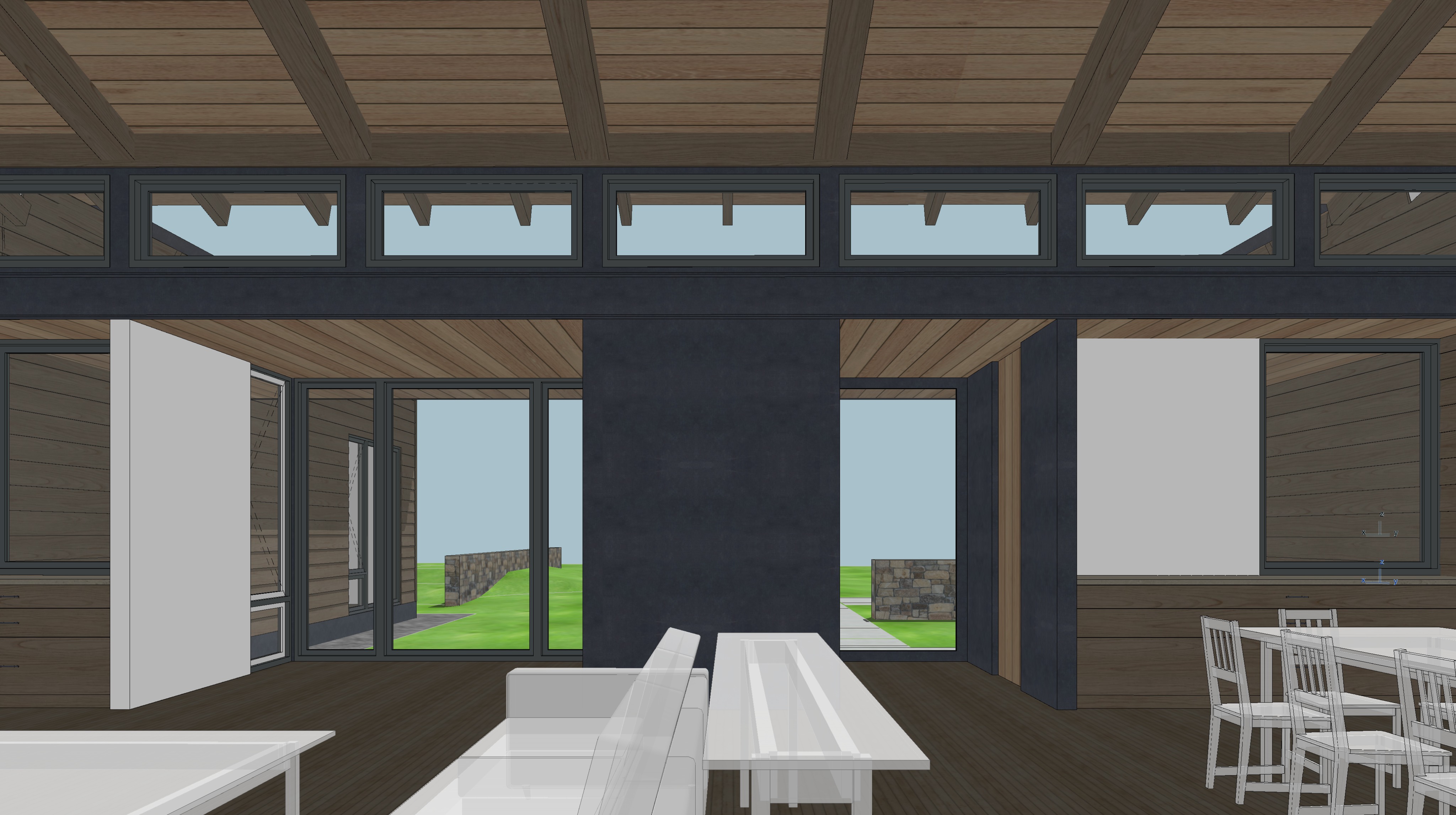 white oak table and chairs fabric couch wild mountain grasses outside mountains close in the background