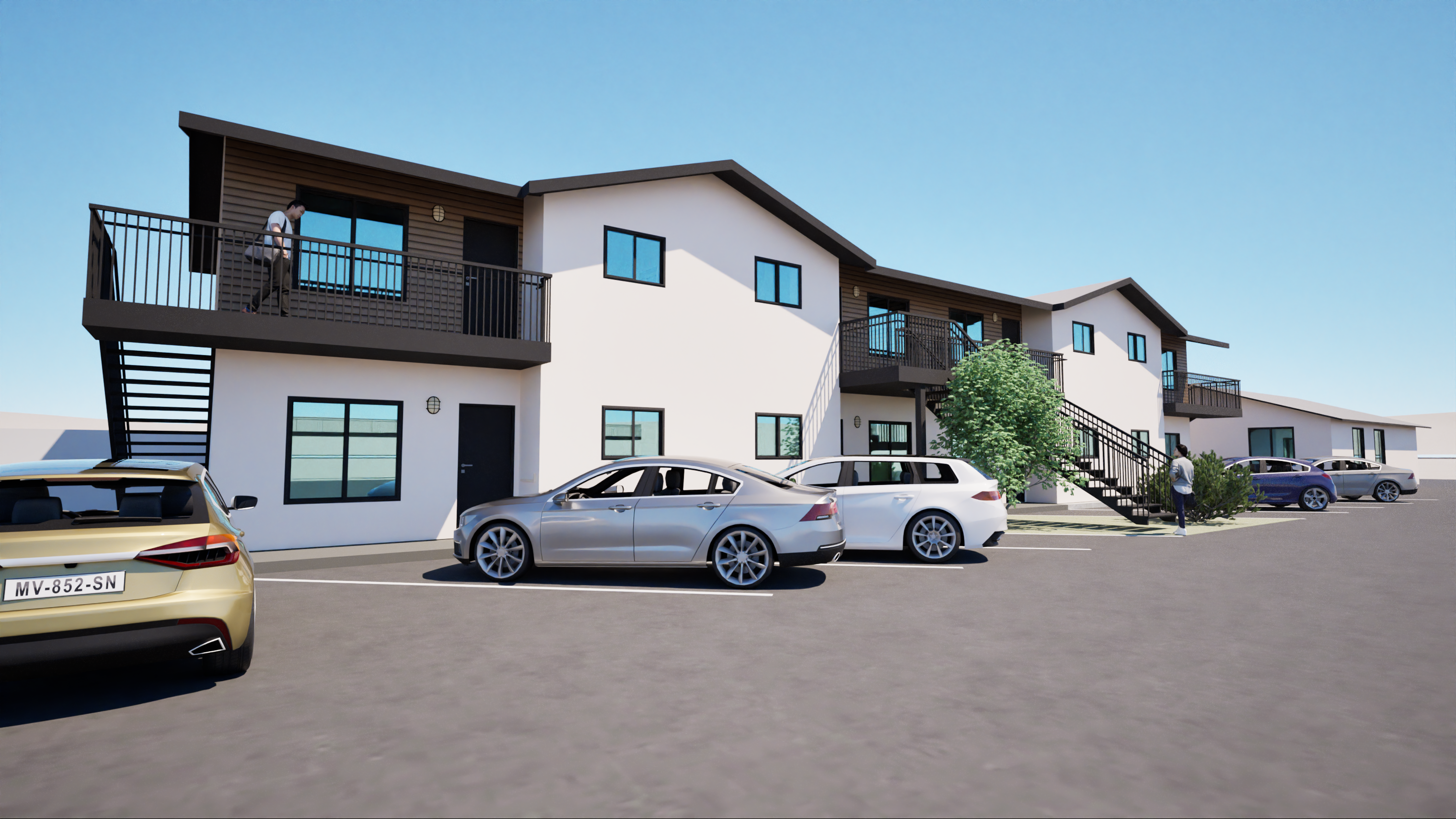 convert into modern style with textured white plaster stucco walls and cedar wood siding on the second floor with california landscape and oak trees on a bright sunrise california background