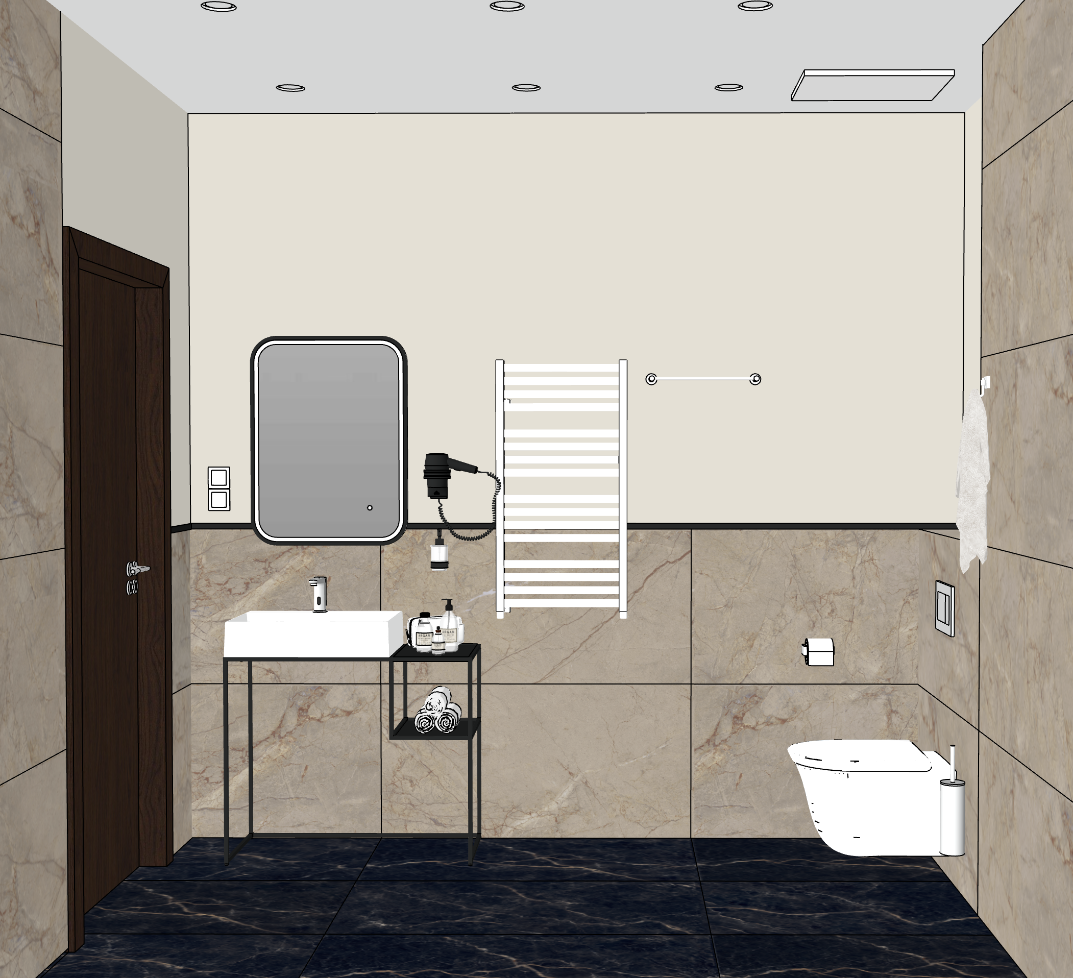 interior shot bathroom hotel room tehre is led mirror tiles are 120x60 and cabin is chrom